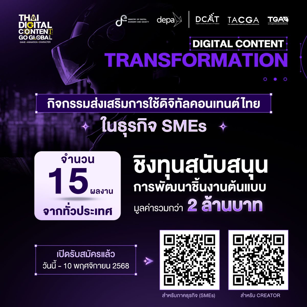 Digital Content Transformation หนึ่งในกิจกรรมสำคัญของโครงการ Thai Digital Content Go Global เตรียมเปิดโอกาสให้ผู้ประกอบการ SMEs จับคู่กับครีเอเตอร์ไทย เจ้าของผลงาน ‘คาแรกเตอร์’ สุดสร้างสรรค์ ชิงทุนสนับสนุนการพัฒนาชิ้นงานต้นแบบ ทุนละ 150,000 บาท ทั้งหมด 15 ทุน รวมมูลค่ากว่า 2,250,000 บาท โดยผู้เข้าร่วมกิจกรรมจะได้พบกับเวิร์คช็อปสุดเข้มข้น และกิจกรรมเสริมสร้างความรู้ที่มาพร้อมเนื้อหาสำคัญ ไม่ว่าจะเป็น การจัดการทรัพย์สินทางปัญญา การพัฒนาและต่อยอดผลิตภัณฑ์ การทำการตลาด รวมถึงการสร้างแบรนด์ให้เป็นที่รู้จักในวงกว้าง ทั้งหมดเพื่อเป็นการต่อยอดผลงานของ ครีเอเตอร์ไทยควบคู่ไปกับการสร้างมูลค่าเพิ่มให้กับผลิตภัณฑ์หรือบริการของเหล่าผู้ประกอบการ อีกทั้งเป็นการเพิ่มขีดความสามารถทางการแข่งขันในตลาดสากล