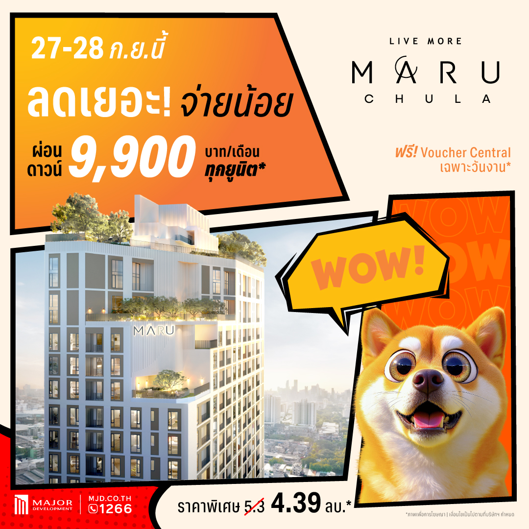 ดร.สุริยา พูลวรลักษณ์ กรรมการผู้จัดการ บริษัท เมเจอร์ ดีเวลลอปเมนท์ จำกัด (มหาชน) เปิดเผยว่า บริษัทเตรียมจัดอีเว้นท์พิเศษ ณ “โครงการมารุ จุฬา” (MARU CHULA) ในวันที่ 27-28 กันยายนนี้ โดยเปิดตัว แคมเปญ “ลดเยอะ จ่ายน้อย” โปรโมชันพิเศษเฉพาะในงาน มอบส่วนลดจาก 5.3 ล้านบาทต่อยูนิต เหลือ 4.39 ล้านบาทต่อยูนิต ซึ่งถือเป็นราคาดีที่สุดในโซนสามย่าน พร้อมผ่อนดาวน์เริ่มต้น 9900 บาท/เดือน โดยเชื่อว่าด้วยแคมเปญที่แรงและคุ้มค่า จะดึงดูดลูกค้าเข้าร่วมงานและปิดการขายได้อย่างงดงาม