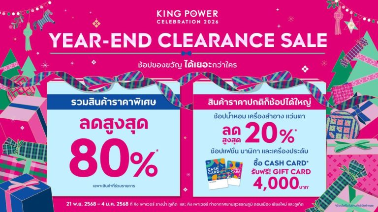 คิง เพาเวอร์ จัดแคมเปญสุดยิ่งใหญ่ส่งท้ายปี “YEAR – END CLEARANCE SALE” พบกับสินค้าสุดเอ็กซ์คลูซิฟจากแบรนด์ดัง ลดกระหน่ำสูงสุดถึง 80% เอาใจทุกไลฟ์สไตล์ ทั้งแฟชั่น น้ำหอม เครื่องสำอาง…