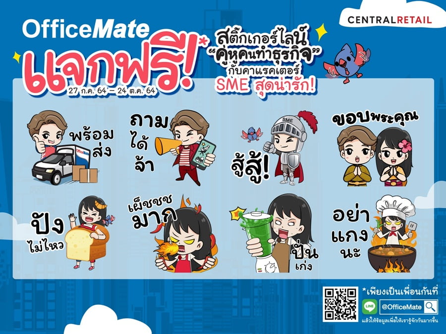 ออฟฟิศเมท ในเครือเซ็นทรัลรีเทล ขอส่งกำลังใจให้ SME ไทย #ฝ่าฟันโควิด #ยิ้มสู้ไปด้วยกัน  ออฟฟิศเมทได้ออกแคมเปญใหม่ล่าสุด มอบโค้ดส่วนลดเพิ่มมูลค่ารวมกว่า 500 บาท* ให้กับทุกท่าน ที่ดาวน์โหลดสติกเกอร์ไลน์คาแรคเตอร์ SME สุดน่ารัก ชื่อชุด “คู่หูคนทำธุรกิจ”  ผ่าน Line: @OfficeMate คลิกเลย https://line.me/S/sticker/24009  ตั้งแต่ 27 ก.ค. 64 – 24 ต.ค. 64 ใช้โค้ดส่วนลดนี้ เพื่อลดเพิ่ม เมื่อช้อปซื้อสินค้าที่ช่องทางออนไลน์ Website : OfficeMate.co.th, OfficeMate Mobile App  และ  Chat&Shop ผ่าน Line @OfficeMate เท่านั้น  (ตามเงื่อนไขที่บริษัทฯ กำหนด)