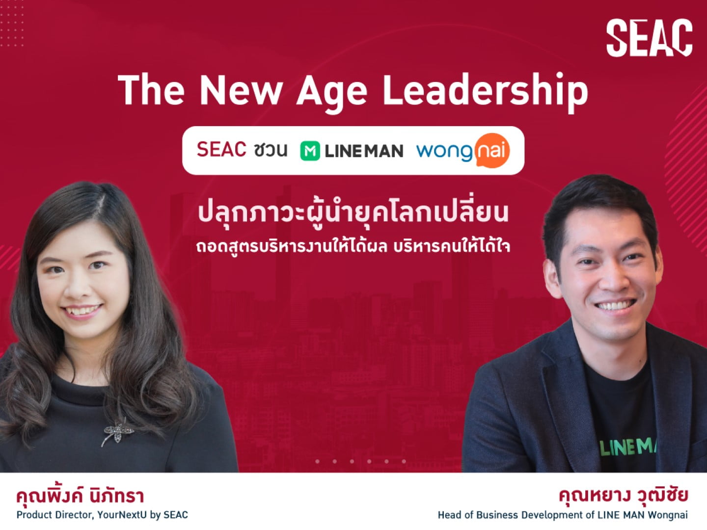 นอกจากนี้ SEAC ยังได้เชิญชวนผู้นำองค์กรยุคใหม่ ที่ไม่เพียงสามารถพลิกวิกฤติให้เป็นโอกาสในการเป็นผู้นำตลาดฟู้ดเดลิเวอรี่แต่ยังสร้างองค์กรที่มีพนักงานเลือดใหม่ที่พร้อมเผชิญวิกฤติและสร้างโอกาสเติบโตก้าวกระโดดสวนกระแสอย่างคุณวุฒิชัย น้ำใจประเสริฐ ผู้อำนวยการฝ่ายพัฒนาธุรกิจ LINE MAN Wongnai ซึ่งได้มาร่วมแบ่งปันมุมมองและถอดรหัสความหมายของคำว่า ‘ภาวะผู้นำยุคใหม่ (The New Age Leadership)’ ที่สามารถสร้างรากฐานให้องค์กรเข้มแข็งผ่านการทำงานที่ไม่เพียงเน้นผลลัพธ์ แต่ได้ใจพนักงานเพื่อสร้างแรงขับในการทำสิ่งใหม่ๆ อย่างต่อเนื่อง