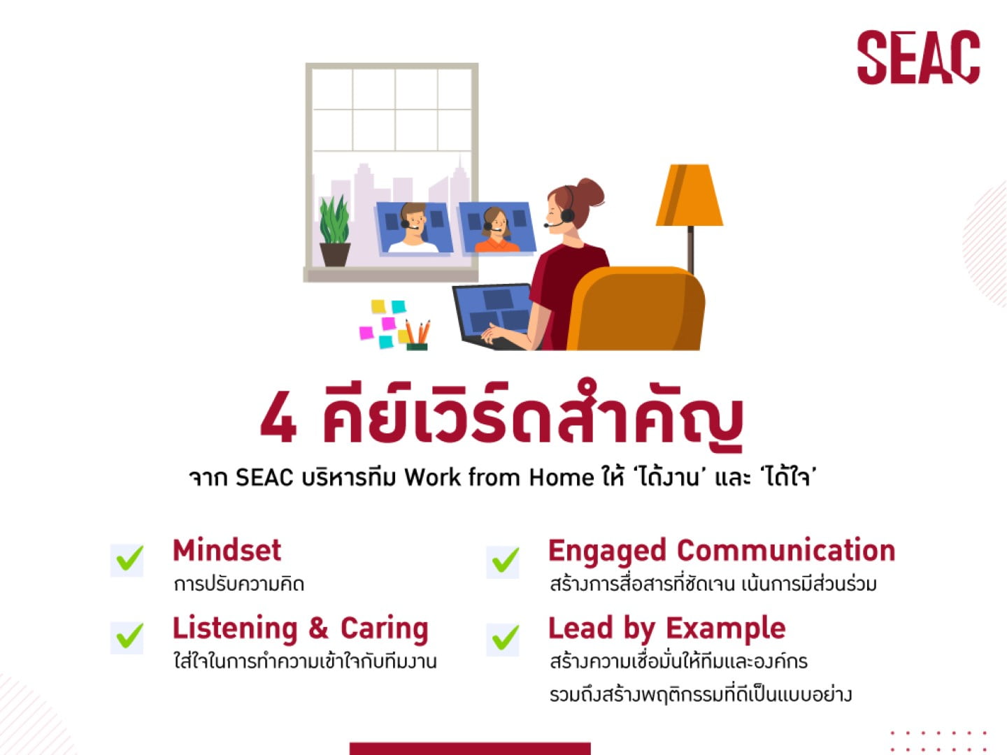 SEAC ในฐานะผู้นำด้านการพัฒนาผู้บริหารและบุคลากรในองค์กรมาตลอด 30 ปี เราพบว่า การบริหารทีมทำงานเพื่อขับเคลื่อนองค์กรแบบเป็นหนึ่งเดียว ผู้นำจะขับเคลื่อนผลลัพธ์ได้ต้องใช้ทักษะในสามด้านคือ ทักษะด้านการคิด (Head) ซึ่งเป็นเรื่องของมุมมองและ การกำหนดทิศทาง อีกส่วนคือ เรื่องของการสร้างขวัญและกำลังใจ (Heart) และเรื่องของการขับเคลื่อนและพัฒนาให้ทีมงานสามารถ ลองมือทำ (Hand) ไปพร้อมกัน ซึ่งบริบทการทำงานที่เปลี่ยนไปทำให้ทีมงานเราอยู่ในสถานการณ์ที่ต้องเผชิญกับความไม่แน่นอน หลายคนต้องปรับตัวมาก ทำในสิ่งที่ไม่เคยทำ หลายคนเกิดความเครียดรู้สึกถึงความไม่แน่นอนในสิ่งที่ทำอยู่ บางคนปรับตัวไม่ได้ เกิดสภาวะจิตตก หรือ Burn Out เมื่อทีมงานแต่ละคนอยู่ในสถานการณ์ต่างกัน ต้องรับผิดชอบงานที่ต่างกัน ประเด็นสำคัญคือ การเป็นผู้นำยุคนี้ต้องอ่านลูกน้องให้ออก และปรับรูปแบบที่ใช้ตามแต่สถานการณ์ อย่าใช้รูปแบบของ One-Size-Fit-All เพราะสิ่งที่เราทำ ที่เราให้อาจไม่ตรงกับสิ่งที่ลูกน้องเรากำลังต้องการก็ได้ ดังนั้น การเป็นผู้นำในยุคนี้แทนที่จะเน้นที่สไตล์การนำที่เราเคยใช้ได้ผลดี อาจต้องเน้นการ “ใส่ใจ” และ “ทำความเข้าใจ” ในสิ่งที่ทีมงานต้องการการสนับสนุนจากเราบทโจทย์งานและสถานการณ์ของเค้า ที่เปลี่ยนไปในแต่ละช่วงมากกว่าเพื่อปรับสไตล์และวิธีการให้เหมาะกับแต่ละช่วง