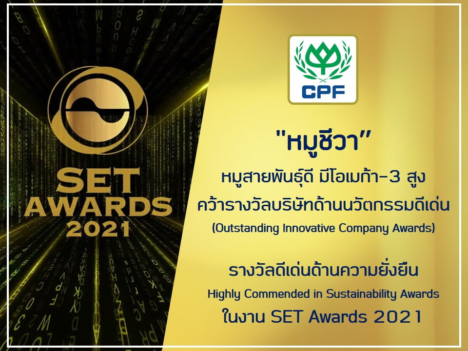 รางวัล SET Awards 2021 จัดขึ้นเป็นปีที่ 18 โดยตลาดหลักทรัพย์แห่งประเทศไทย ร่วมกับวารสารการเงินธนาคาร ซึ่งปีนี้ ซีพีเอฟได้รับการพิจารณาคัดเลือกให้ได้รับรางวัล SET Awards ในกลุ่มรางวัล Sustainability Excellence ประเภท Highly Commended in Sustainability Awards และในกลุ่มรางวัล Business Excellence ได้รับรางวัลบริษัทด้านนวัตกรรมดีเด่น (Outstanding Innovative Company Awards) จากผลิตภัณฑ์หมูชีวา ซึ่งเป็นนวัตกรรมเนื้อสัตว์ที่เริ่มพัฒนาหมูตั้งแต่สายพันธุ์ อาหาร ตลอดจนวิธีการเลี้ยงที่เป็นมิตรกับสิ่งแวดล้อม เพื่อให้ได้มาซึ่งเนื้อหมูมีโอเมก้า-3 สูง ตอบโจทย์ความต้องการของผู้บริโภค โดย นายสิริพงศ์ อรุณรัตนา ประธานผู้บริหารฝ่ายปฎิบัติการธุรกิจสัตว์บก ซีพีเอฟ เป็นผู้แทน เข้ารับรางวัล