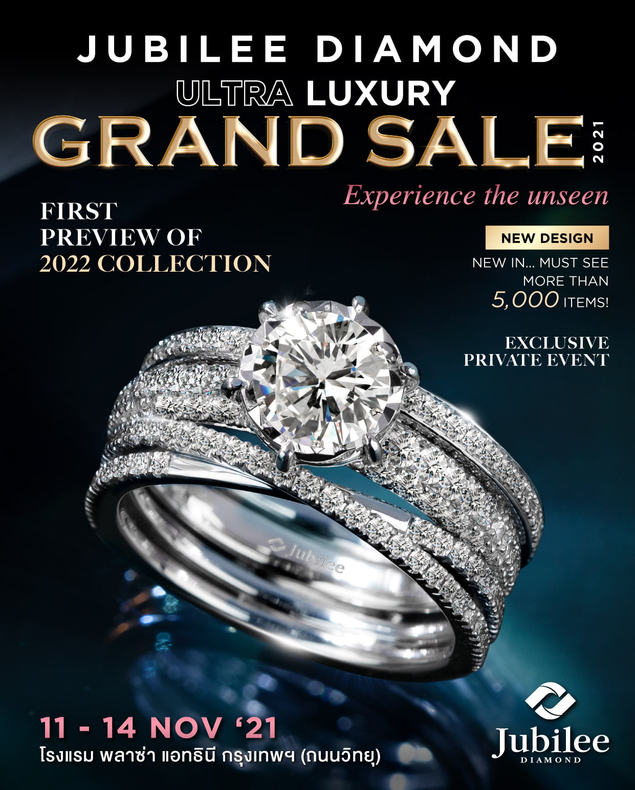 สำหรับช่วงเทศกาลปลายปี 2564 นี้ เป็นช่วงเวลาพิเศษในวาระโอกาสต่าง ๆ ยูบิลลี่ ไดมอนด์ พร้อมพันธมิตรบัตรเครดิตชั้นนำ เล็งเห็นความสำคัญและต้องการร่วมเป็นส่วนหนึ่งในช่วงเทศกาลของคนไทย จึงเดินหน้าจัดอีเว้นท์ครั้งยิ่งใหญ่ของปี 2564 ภายใต้ชื่อ Jubilee Ultra Luxury Grand Sale 2021 มหกรรมงานลดราคาสินค้าเครื่องประดับเพชรครั้งยิ่งใหญ่แห่งปี โดยงานนี้เป็น Exclusive Private Sale งานใหญ่ที่จัดเต็มสินค้าเครื่องประดับเพชรสุดอลังการ เปิดตัวไฮไลท์สำคัญสินค้าคอลเลคชั่นใหม่ล่าสุดปี 2022 ที่จะได้เห็นครั้งแรกภายในงานที่เดียวก่อนวางจำหน่ายจริงในปี 2022  นอกจากนี้ภายในงานยังมี เพชรกะรัต ทุกสี ทุกขนาด, เพชรทรงแฟนซี และ สินค้าระดับมาสเตอร์พีช มากกว่า 5,000 ดีไซน์ รวมถึงเพชรจากแบรนด์ดังระดับโลกอย่าง De Beers Forevermark ที่ได้นำเพชร Black Label  เพชรที่เจียระไนได้สัดส่วนที่เพอร์เฟคที่สุดส่งตรงมาร่วมงานนี้เป็นครั้งแรก และมากไปกว่านั้นภายในงานยังจัดเต็มมอบสิทธิพิเศษต่าง ๆ มากมายให้กับลูกค้ายูบิลลี่ ไดมอนด์ ตั้งแต่การลดราคาสินค้าสุดพิเศษ แลกคะแนนรับ Gift Voucher ส่วนลดทันทีภายในงาน และแลกคะแนนบัตรเครดิตใช้เป็นส่วนลดเพิ่ม พร้อมรับของสมนาคุณ อาทิ แหวนเพชร 1 กะรัต การเจียระไนแบบ Triple Excellent พร้อม GIA Certificate, iPhone13Pro และอื่น ๆ อีกมากมาย โดยงานดังกล่าวจะจัดขึ้นในวันที่ 11 – 14 พฤศจิกายน 2564 โรงแรมพลาซ่า แอทธินี กรุงเทพ