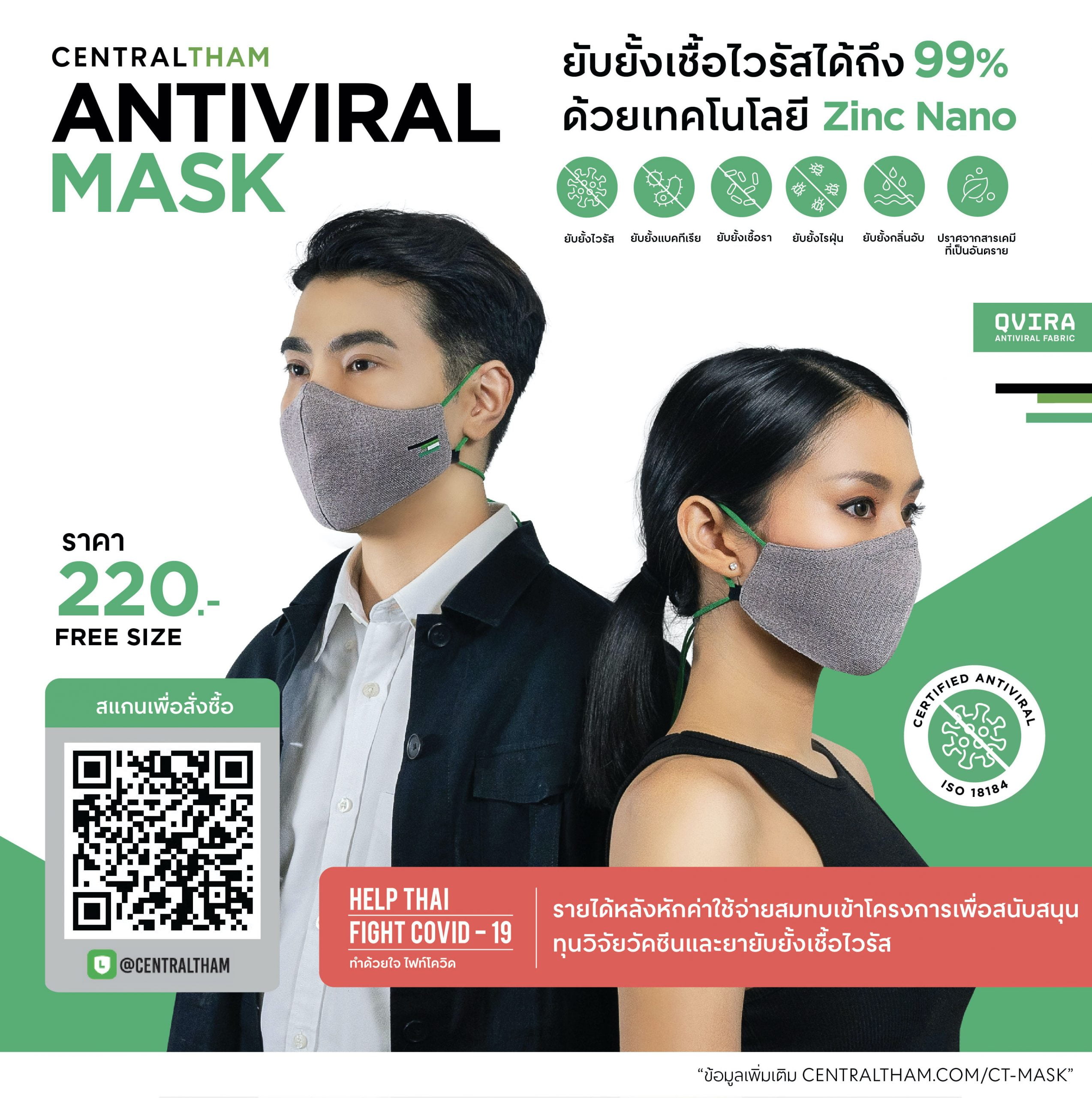 เกือบ 2 ปีที่ผ่านมาที่ทุกคนต้องอยู่กับไวรัสโควิด-19 หน้ากากอนามัยจึงเป็นเสมือนปัจจัยที่ 5 ในการดำรงชีวิต เพื่อให้คนไทยทุกคนได้ป้องกันตนเองได้มากขึ้น เซ็นทรัล ทำ จึงได้ผลิตหน้ากากผ้า เซ็นทรัล ทำ แอนไทไวรัล มาส์ก (Central Tham Antiviral Mask) ที่ใช้ Zinc Nano เทคโนโลยีในการผลิต ด้วยเส้นใยผ้าอัจฉริยะ QVIRA (คิวไวรา) นวัตกรรมในการต่อสู้เชื้อโคโรนาไวรัส สามารถจัดการเชื้อโรคและเชื้อไวรัสให้สิ้นสภาพทันทีที่สัมผัสและมีประสิทธิภาพสูงถึง 99% ประสิทธิภาพสูงและรวดเร็วที่สุด ด้วยหลักการ Ion Polarity หนามและเกราะโปรตีนของไวรัสที่มีสถานะเป็นประจุลบ จะถูกทำลายเมื่อเกิดกระบวนการแลกประจุกันกับเส้นใยผ้า QVIRA ที่มีสภาพเป็นประจุบวก รวมไปถึงแบคทีเรีย เชื้อรา ไรฝุ่น และกลิ่นอับ อีกทั้งยังสามารถ ซักได้มากกว่า 150 ครั้ง แต่ยังคงประสิทธิภาพสูงถึง 99% สูงกว่าผลิตภัณฑ์ที่ใช้สารเคมีเคลือบถึง 7 เท่า มาพร้อมคุณสมบัติของผ้าคอลลาเจนด้านใน ที่ช่วยคงความชุ่มชื้น ลดการระคายเคือง หายใจได้อย่างเต็มที่ และไม่มีสารเคมีที่เป็นอันตรายต่อร่างกาย เพิ่มความปลอดภัยให้ตัวคุณ ในราคา 220 บาท มีวางจำหน่ายแล้วตั้งแต่วันนี้ไปจนกว่าสินค้าจะหมด ณ จุดขายและช่องทางออนไลน์ภายใต้กลุ่มธุรกิจในเครือกลุ่มเซ็นทรัลทั่วประเทศ พร้อมมอบความช่วยเหลือสู่สังคม ด้วยการสนับสนุนโครงการ “ทำด้วยใจ ไฟท์โควิด-19” (HELP THAI FIGHT COVID-19) เพื่อต่อยอดทุนวิจัยวัคซีนและยาป้องกันยับยั้งเชื้อไวรัส COVID-19 รายได้หลังหักค่าใช้จ่าย จากการจำหน่ายหน้ากากผ้า เซ็นทรัล ทำ แอนไทไวรัล มาส์ก จะนำไปมอบให้ 3 กองทุนวิจัย ของคณะแพทยศาสตร์ ศิริราชพยาบาล คณะ แพทยศาสตร์ โรงพยาบาลรามาธิบดี และ คณะแพทยศาสตร์ จุฬาลงกรณ์มหาวิทยาลัย