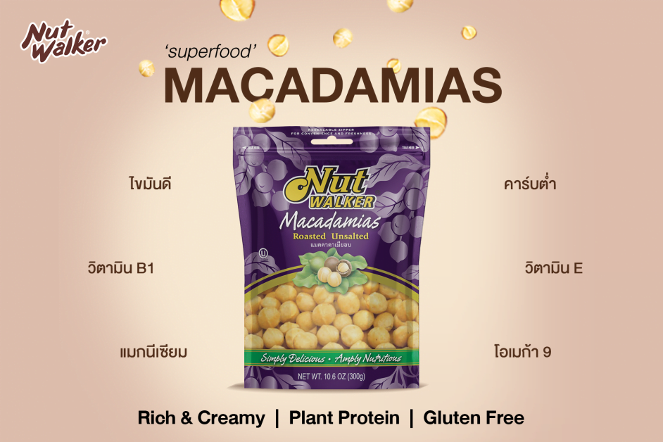 ครั้งนี้ นัท วอล์คเกอร์ ขนมขบเคี้ยวประเภทถั่วคุณภาพพรีเมียมภายใต้เครือเฮอริเทจ จึงขอแนะนำ “แมคคาเดเมีย” ธัญพืชเพื่อสุขภาพที่หลายคนนับเป็นหนึ่งในอาหารสุดโปรดปรานของตนเอง เพราะไม่เพียงแต่รสชาติที่อร่อย หวานมัน หอม กรอบ และนุ่ม ก็ยังได้ประโยชน์มากมายจากการรับประทานสุดยอดธัญพืชชนิดนี้ ซึ่งถั่วชนิดนี้อุดมไปด้วยไขมันดี, สารต้านอนุมูลอิสระ หรือวิตามินอี ซึ่งมีคุณสมบัติในการช่วยลดระดับคอเลสเตอรอล, วิตามิน B1 เป็นวิตามินที่จำเป็นต่อการเจริญเติบโต และมีส่วนช่วยสำคัญในการกระตุ้นการทำงานของเซลล์ประสาทและระบบหัวใจ, แมกนีเซียม เป็นแร่ธาตุที่จำเป็นต่อสุขภาพกล้ามเนื้อ เส้นประสาท และกระดูก, โอเมก้า 9 เมื่อได้รับในปริมาณที่เหมาะสมต่อร่างกาย จะช่วยเรื่องการคุมระดับน้ำตาลในเลือดได้ แถมคาร์บต่ำ และด้วยคุณค่าทางโภชนาการนี้เอง ทำให้แมคคาเดเมียกลายเป็นธัญพืชที่ขึ้นชื่อว่าเป็นราชาแห่งถั่ว อีกทั้งยังเป็นที่นิยมในการนำไปประกอบอาหารทั้งคาวหวานได้หลากหลายประเภท