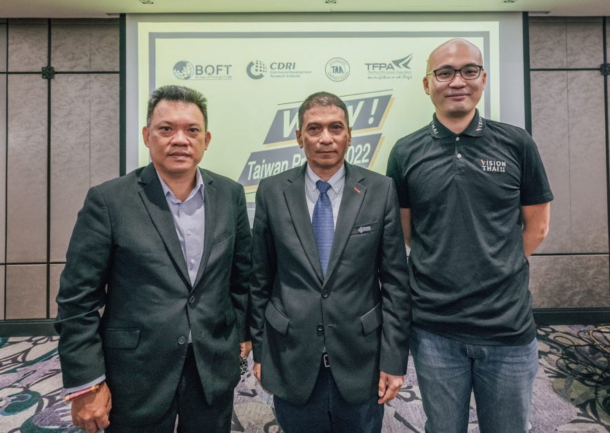 นายเจริญ แก้วสุกใส ประธานกลุ่มอุตสาหกรรมอาหาร และเครื่องดื่ม สภาอุตสาหกรรมแห่งประเทศไทย และนายหลี่ จื้อ เต๋อ กรรมการผู้จัดการ บริษัท Vision Thai พร้อมด้วย นายธรรศ ทังสมบัติ นายกสมาคมผู้ผลิตอาหารสำเร็จรูป ร่วมเป็นประธานเปิดงาน Wow! Taiwan Project 2022
