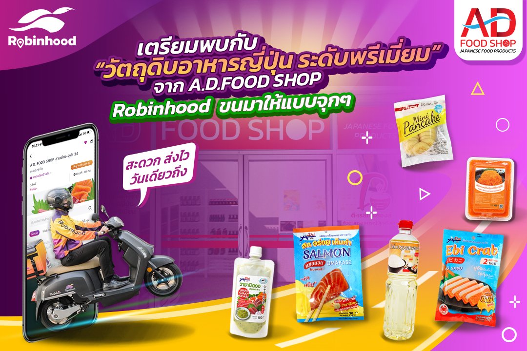 A.D. Food Group จับมือ Robinhood Super APP  ให้บริการผู้ค้าส่ง, ผู้ค้าปลีก, ภัตตาคาร ร้านอาหาร, home cook และลูกค้าทั่วไป สามารถสั่งซื้อผลิตภัณฑ์วัตถุดิบอาหารญี่ปุ่น, ผลิตภัณฑ์อาหารญี่ปุ่นพร้อมปรุง และผลิตภัณฑ์อาหารญี่ปุ่นพร้อมทานของ A.D.Food Group ภายใต้แบรนด์ เอ-ได ผ่าน A.D. Food Shop   ในแพลตฟอร์ม Robinhood Supermarket  พร้อมบริการจัดส่งผลิตภัณฑ์ทุกประเภทด้วยมาตรฐานระดับสากล รวมทั้งการจัดส่งสินค้ากลุ่ม Chill&Frozen ด้วยเทคโนโลยีและนวัตกรรมการจัดเก็บรักษาอุณหภูมิ ให้ถึงมือของลูกค้าด้วยความสดใหม่ตลอดเวลา