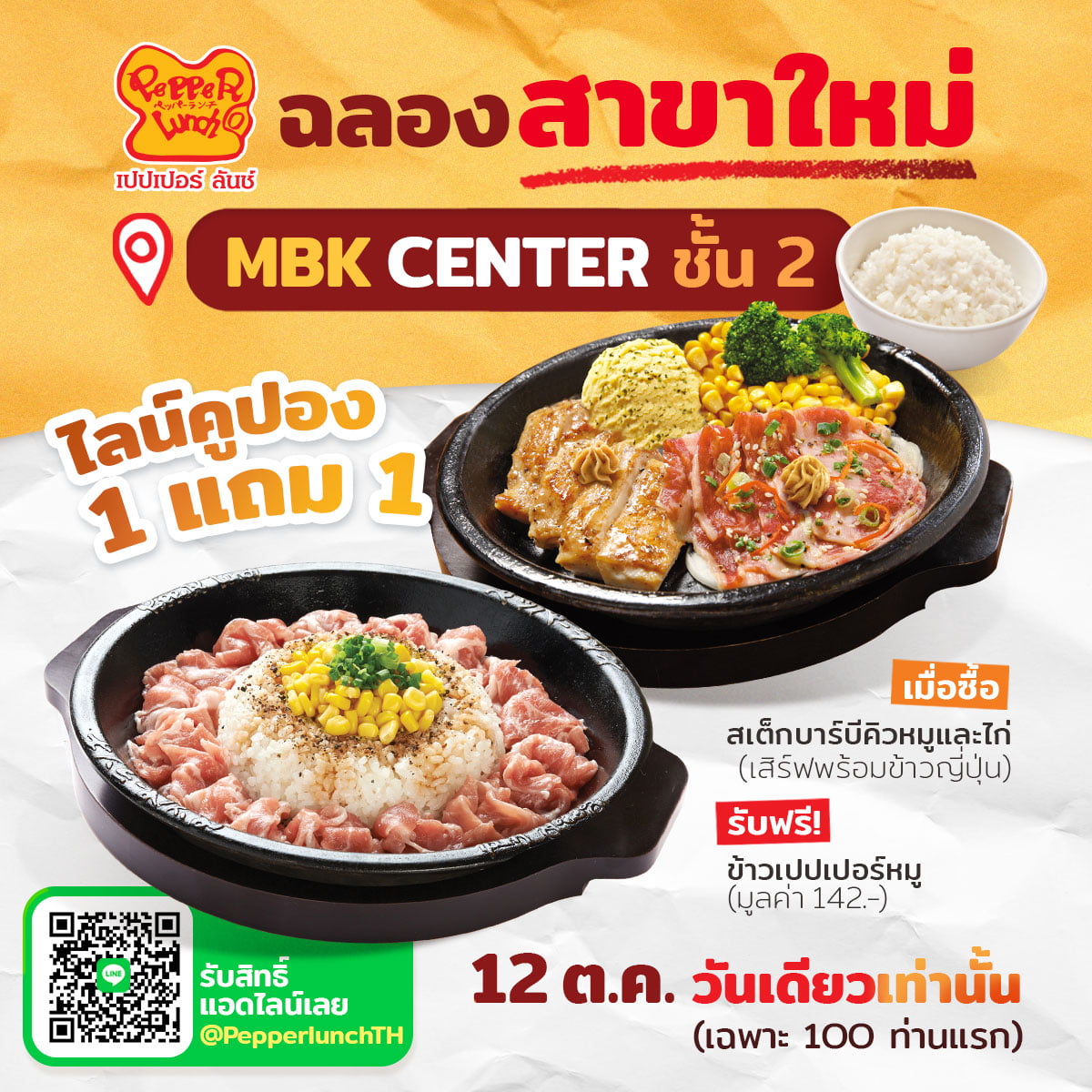 เอ็ม บี เค เซ็นเตอร์ ชวนสายกินฟินกับส่วนลดสุดคุ้มของแถมดีต่อใจฉลองสาขาใหม่ PEPPER LUNCH พร้อมโปรสุดพิเศษ! สำหรับลูกค้า 100 ท่านแรก 1 แถม 1 เฉพาะวันที่ 12 ตุลาคมวันเดียวเท่านั้น