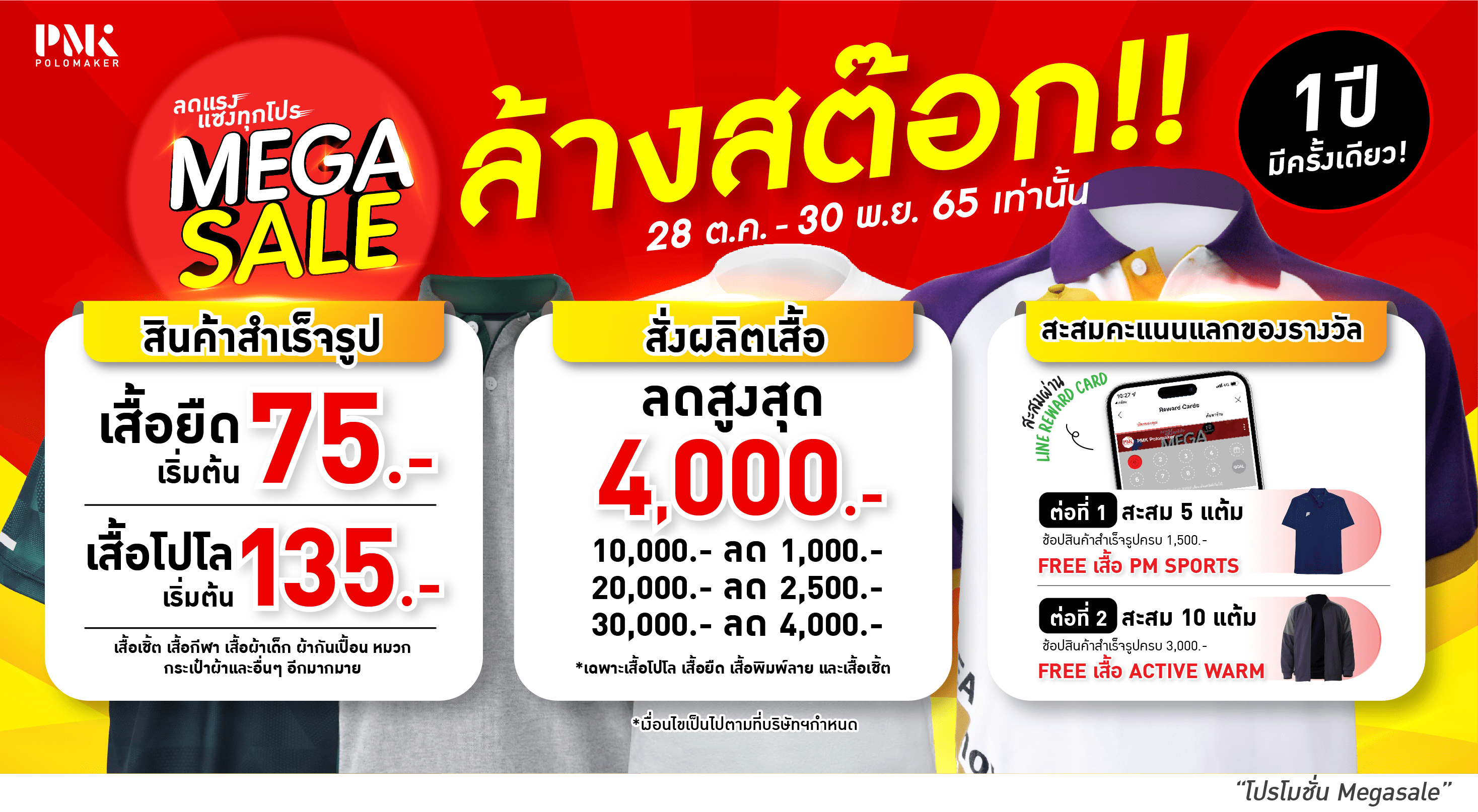 PMK POLOMAKER จัดโปรโมชั่นครั้งใหญ่ MEGA SALE เพื่อขอบคุณลูกค้าทุกท่านที่ให้การสนับสนุนมาโดยตลอด ในงานจะพบกับสินค้าสำเร็จรูป เสื้อโปโล เสื้อเชิ้ต เสื้อกีฬา เสื้อยืดในราคาพิเศษ เริ่มต้นเพียง 75 บาท พิเศษ! เฉพาะลูกค้าที่ซื้อสินค้าสำเร็จรูปหน้าร้าน สามารถสะสมคูปองผ่าน Line Reward Cards ทุกยอดการสั่งซื้อครบทุก 300 บาท จะได้รับ 1 แต้ม สะสมครบ 5 แต้ม รับฟรี! เสื้อ PM SPORTS 1 ตัว สะสมครบ 10 แต้ม รับฟรี! เสื้อ ACTIVE WARM 1 ตัว บอกเลยงานนี้จัดหนักจัดเต็ม เรียกว่ายิ่งช้อปยิ่งคุ้ม