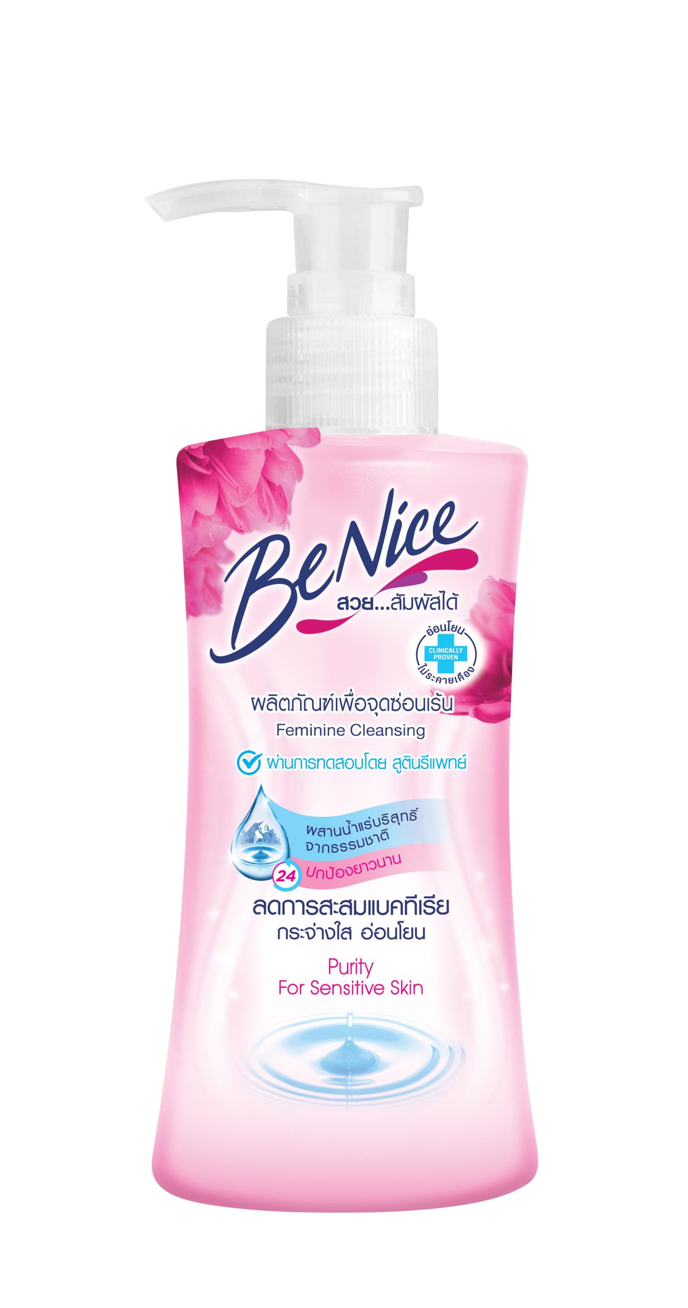 BeNice Feminine Cleansing Purity for Sensitive Skin บีไนซ์ เฟมินีน คลีนซิ่ง เพียวริตี้ ฟอร์ เซนซิทีฟ สกิน (สีชมพูใส) ผลิตภัณฑ์ทำความสะอาดจุดซ่อนเร้น อ่อนโยนต่อผิวยิ่งกว่าด้วยคุณค่าสารสกัดจากธรรมชาติถึง 4 ชนิด ทั้งลาเวนเดอร์ โรสแมรี่ เซจ และไทม์ ที่มีคุณสมบัติต่อต้านอนุมูลอิสระ ผสานคุณค่าน้ำแร่บริสุทธิ์จากธรรมชาติจากฝรั่งเศส เพื่อผิวบอบบาง แพ้ง่าย และผ่านการทดสอบโดยสูตินรีแพทย์ ว่าอ่อนโยน ไม่ระคายเคืองผิว ลดการสะสมของแบคทีเรีย มั่นใจใช้ได้ทุกวัน โดยเฉพาะช่วงที่มีประจำเดือน ปราศจากส่วนผสมของสบู่ ซิลิโคน พาราเบน ไตรโคซาน