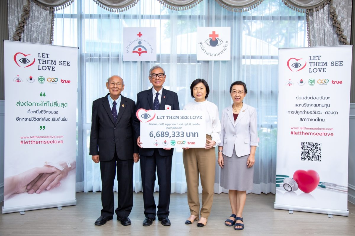 สภากาชาดไทย โดย นายเตช บุนนาค เลขาธิการ (ที่ 2 จากซ้าย) พร้อมด้วย ศูนย์รับบริจาคอวัยวะ โดย นายแพทย์วิศิษฎ์ ฐิตวัฒน์ ผู้อำนวยการ (ซ้ายสุด) และ ศูนย์ดวงตา โดย ผู้ช่วยศาสตราจารย์ แพทย์หญิงลลิดา ปริยกนก ผู้อำนวยการ (ขวาสุด) รับมอบเงินบริจาคจากลูกค้ากลุ่มทรูผ่าน SMS ระบบทรูมูฟ เอช รวมถึงแอปพลิเคชันทรูมันนี่ วอลเล็ท และการโอนเงินบริจาคให้กับบัญชีธนาคารของทางศูนย์ฯ จำนวน 6,689,333 บาท ในโครงการ “Let Them See Love 2022” จาก เครือเจริญโภคภัณฑ์ และทรู คอร์ปอเรชั่น โดย นางรุ่งฟ้า เกียรติพจน์ หัวหน้าสายงานสื่อสารแบรนด์ และผู้ช่วยบริหารงานประธานคณะกรรมการบริหาร บริษัท ทรู คอร์ปอเรชั่น (ที่ 2 จากขวา) เพื่อสมทบทุนเป็นค่าใช้จ่ายในกระบวนการบริจาคอวัยวะและดวงตา ณ อาคารเทิดพระเกียรติสมเด็จพระญาณสังวร สภากาชาดไทย
