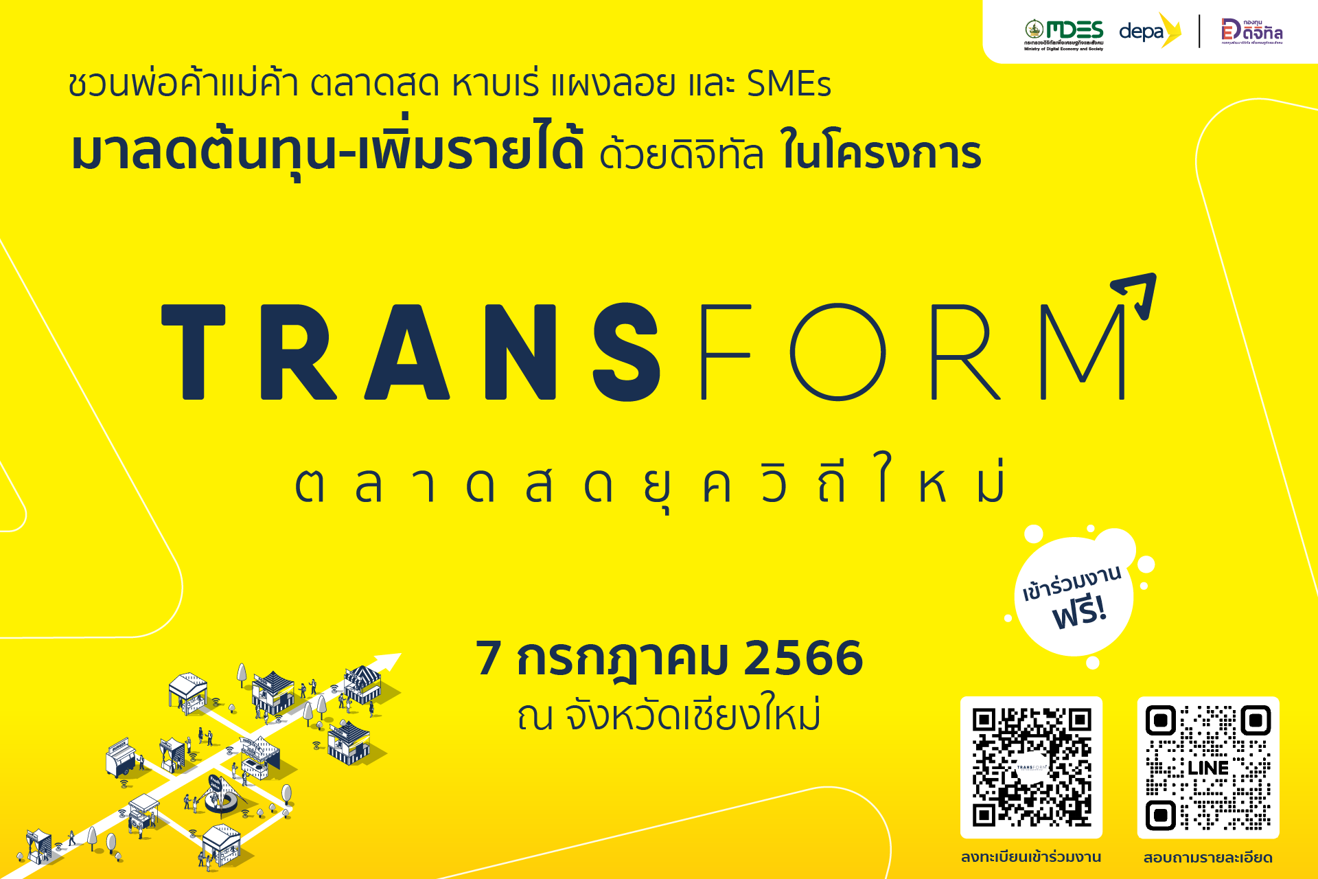 มาลดต้นทุน เพิ่มโอกาส และสร้างรายได้ให้ปังด้วยดิจิทัลไปกับกิจกรรมดี ๆ ที่พร้อมเสิร์ฟถึงที่ตลอดทั้งวันโดยไม่เสียค่าใช้จ่าย ผู้สนใจสามารถลงทะเบียนล่วงหน้าได้ที่ https://bit.ly/3PvPBN8 หรือสอบถามข้อมูลเพิ่มเติมได้ที่ Email: [email protected] และ LINE OA: @transformmarket