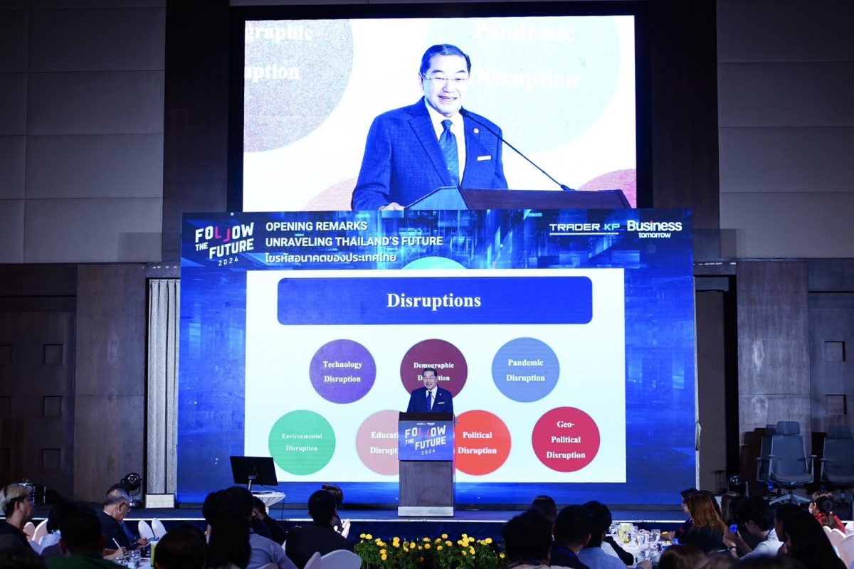 ศาสตราจารย์พิเศษ ดร.สุรเกียรติ์ เสถียรไทย นายกสภาจุฬาลงกรณ์มหาวิทยาลัย และอดีตรองนายกรัฐมนตรีและรัฐมนตรีว่าการกระทรวงการต่างประเทศ กล่าวปาฐกถาในหัวข้อ “Unraveling Thailand’s Future ไขรหัสอนาคตประเทศไทย” ในงานสัมมนา Follow the Future 2024 ซึ่งจัดโดยสื่อ ทันโลกกับ Trader KP และ Business Tomorrow เพื่อชี้ให้เห็นถึงความท้าทายสำคัญที่ประเทศไทยกำลังเผชิญท่ามกลางความเปลี่ยนแปลงของโลก