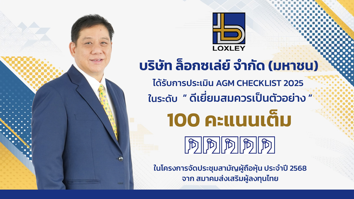 บริษัท ล็อกซเล่ย์ จำกัด (มหาชน) ได้รับคะแนนประเมินคุณภาพการจัดประชุมสามัญผู้ถือหุ้นประจำปี 2568 (AGM Checklist) เต็ม 100 คะแนน ต่อเนื่องเป็นปีที่ 4 ติดต่อกัน (2565–2568) จากสมาคมส่งเสริมผู้ลงทุนไทย (Thai Investors Association: TIA) ภายใต้ภารกิจของสำนักงานคณะกรรมการกำกับหลักทรัพย์และตลาดหลักทรัพย์ (ก.ล.ต.) ถือเป็นการตอกย้ำจุดยืนของ LOXLEY ในการเป็นองค์กรที่ดำเนินธุรกิจด้วยความโปร่งใส ยึดมั่นในหลักธรรมาภิบาล และเคารพสิทธิของผู้ถือหุ้นอย่างสูงสุด