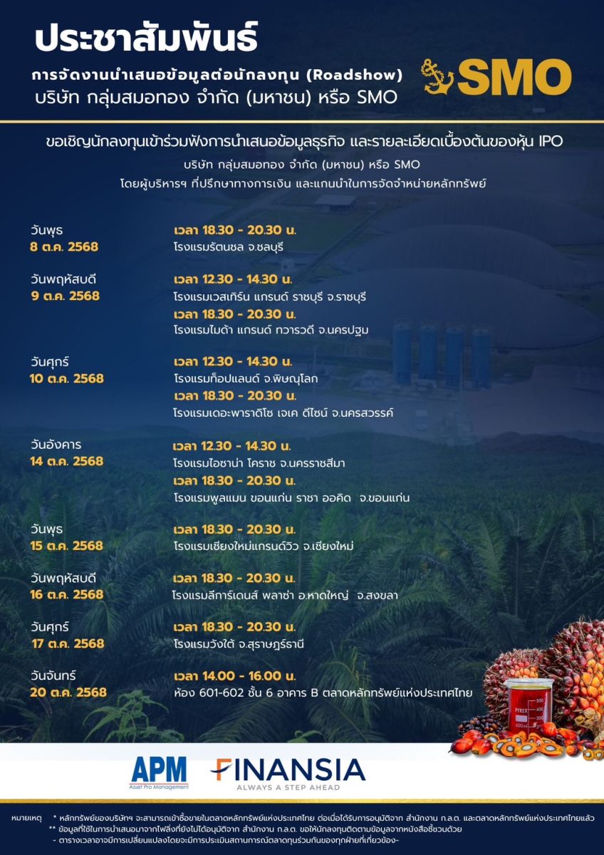 ดร.สมภพ ศักดิ์พันธ์พนม ประธานกรรมการ บริษัท แอสเซท โปร แมเนจเม้นท์ จำกัด หรือ APM ในฐานะที่ปรึกษาทางการเงินของ บริษัท กลุ่มสมอทอง จำกัด (มหาชน) หรือ SMO เปิดเผยว่า บริษัทฯ เตรียมที่จะเดินทางไปนำเสนอข้อมูลกับนักลงทุน หรือโรดโชว์ ของ SMO เพื่อเสนอขายหุ้นให้แก่ประชาชนเป็นครั้งแรก หรือ IPO จำนวน 231.60 ล้านหุ้น โดยจะเดินทางไปนำเสนอข้อมูลกับนักลงทุน 11 จังหวัดประกอบไปด้วย จังหวัดชลบุรีในวันที่ 8 ต.ค. จังหวัดราชบุรีและนครปฐมในวันที่ 9 ต.ค. จังหวัดพิษณุโลกและนครสวรรค์ในวันที่ 10 ต.ค. จังหวัดนครราชสีมาและขอนแก่นในวันที่ 14 ต.ค. จังหวัดเชียงใหม่ในวันที่ 15 ต.ค. อำเภอหาดใหญ่ จังหวัดสงขลาในวันที่ 16 ต.ค. จังหวัดสุราษฎร์ธานีในวันที่ 17 ต.ค.และปิดท้ายการนำเสนอข้อมูลกับนักลงทุนที่ตลาดหลักทรัพย์แห่งประเทศไทย กรุงเทพมหานครในวันที่ 20 ต.ค. 68