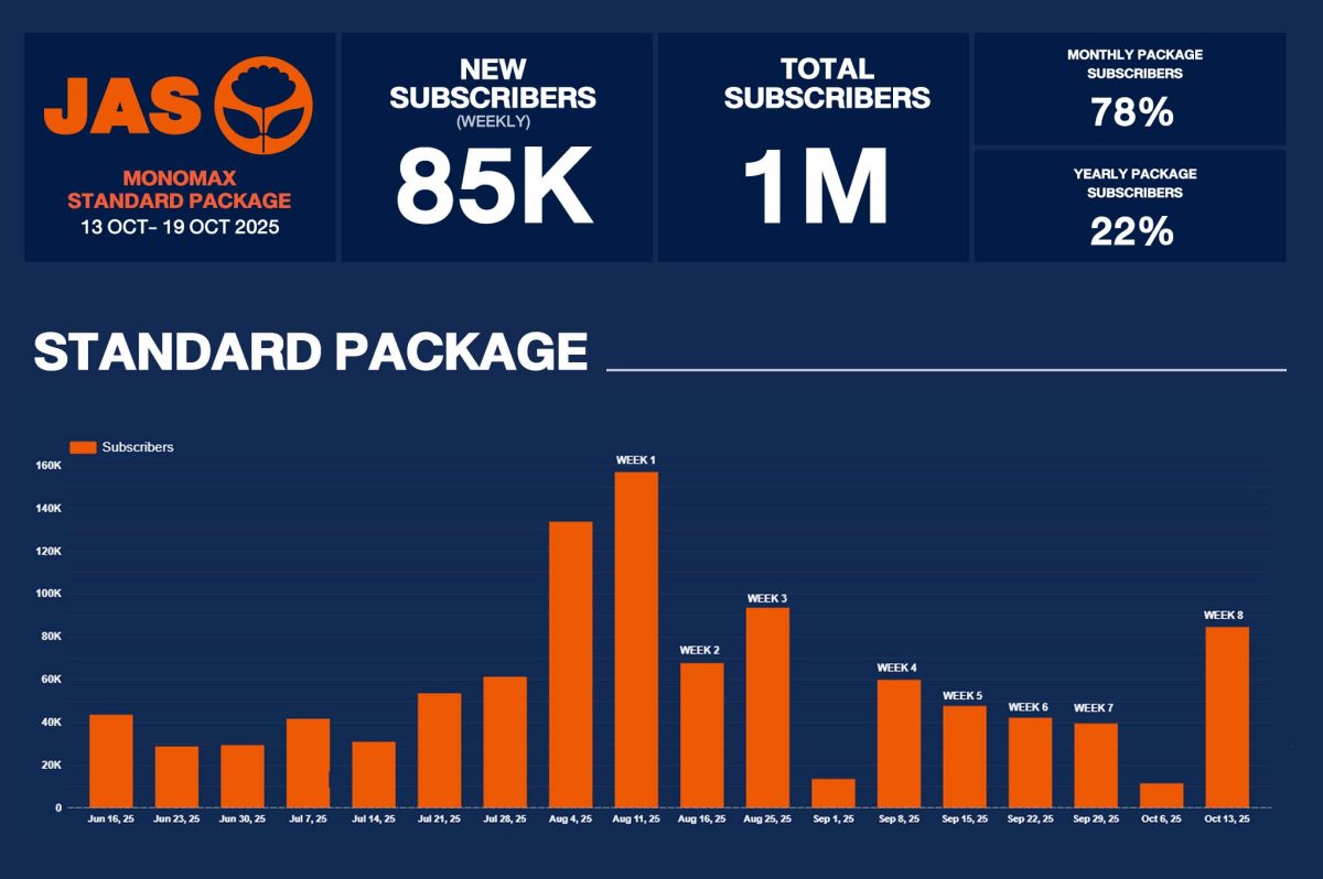 ล่าสุด MONO โชว์ศักยภาพ Monomax แข็งแกร่ง สร้างปรากฏการณ์จากแมตช์ “แดงเดือด” ดันยอดสมาชิกแพ็กเกจ Monomax Standard พุ่งทะลุเกินกว่า 1 ล้านราย สะท้อนการเติบโตของฐานสมาชิกแฟนบอลอย่างต่อเนื่อง พร้อมรุกดันยอดรายได้ไตรมาส 4 ด้วยคอนเทนต์แม่เหล็ก ทั้ง Emirates FA Cup, SV League, Original Series ที่กวาดรางวัลในปีนี้หลายเรื่อง