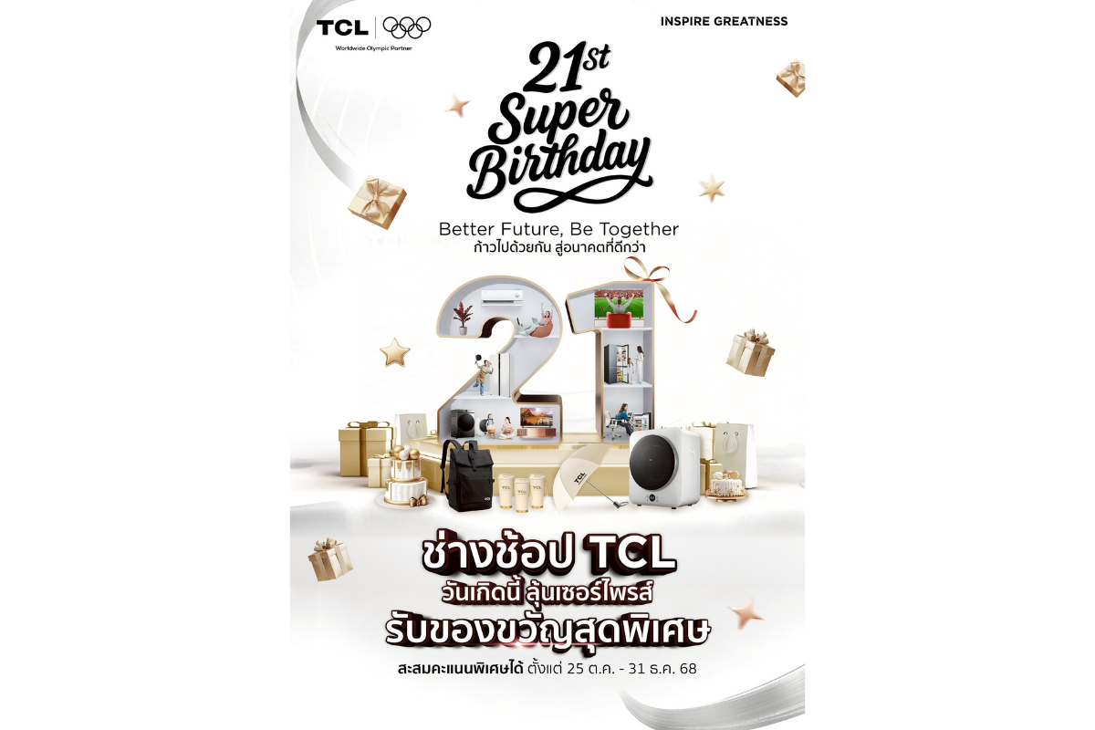 TCL จัดงานฉลองครบรอบ 21 ปี สุดปัง เปิดแคมเปญ 21st Super Birthday | Better Future, Be Together ก้าวไปด้วยกัน สู่อนาคตที่ดีกว่า คืนกำไรลูกค้าครั้งใหญ่ แจกของขวัญมูลค่ารวมกว่า 6,000,000 บาท ช้อปปั๊บ รับเลย เริ่มตั้งแต่วันที่ 25 ต.ค. 68 – 31 ม.ค. 69 พิเศษ ซื้อ Mini LED TV รับฟรีเครื่องอบผ้า Mini Dryer มูลค่า 5,990 บาททันที พร้อมกิจกรรม Super Star Content สุดยอด Content Creator ตัวจริงชิงรางวัลรวม 42 รางวัล มูลค่ารวมกว่า 480,000 บาท ตั้งแต่วันที่ 1 พ.ย. 2568 – 5 ม.ค. 2569 พร้อมเปิดตัว “Super Start Up” เฟ้นหา 21 ผู้ประกอบการรุ่นใหม่ ร่วมสร้างอนาคตที่ดีกว่า