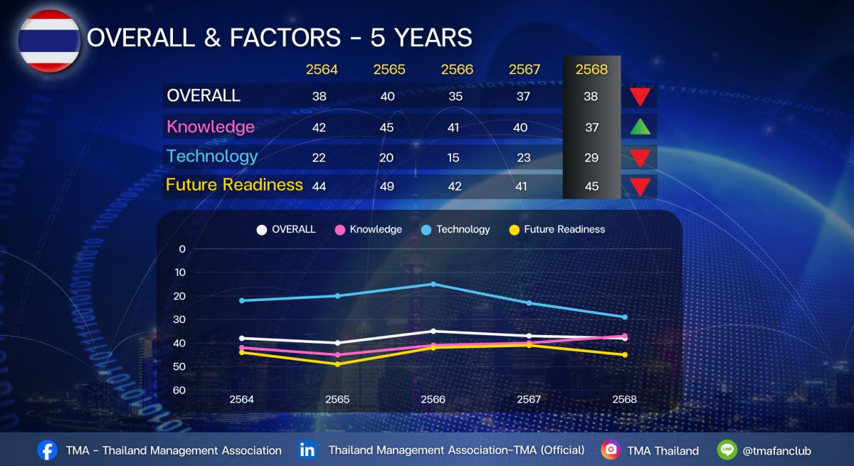 สำหรับประเทศไทย ในรายงาน WDCR 2025 ถูกจัดให้อยู่ในอันดับที่ 38 จาก 69 เขตเศรษฐกิจทั่วโลก ลดลง 1 อันดับจากปีก่อนหน้า สาเหตุหลักมาจากการดิ่งลงอย่างมีนัยสำคัญของปัจจัยหลักด้านเทคโนโลยี (Technology) ซึ่งตกลงถึง 6 อันดับ จากอันดับที่ 23 ในปีก่อนหน้า มาอยู่ที่อันดับ 29 โดยเมื่อพิจารณาในรายละเอียดของปัจจัยย่อยภายใต้หมวดเทคโนโลยี ไม่ว่าจะเป็นกรอบกฎหมาย กฎระเบียบ (Regulatory framework) เงินทุน (Capital) และกรอบโครงสร้างทางเทคโนโลยี (Technological framework) พบว่าอันดับลดลงทั้งหมด ทั้งนี้ ปัจจัยด้านเทคโนโลยีเคยเป็นจุดแข็งสำคัญของไทยมาโดยตลอด โดยย้อนกลับไปในปี 2566 เคยทำอันดับได้ดีถึงอันดับที่ 15