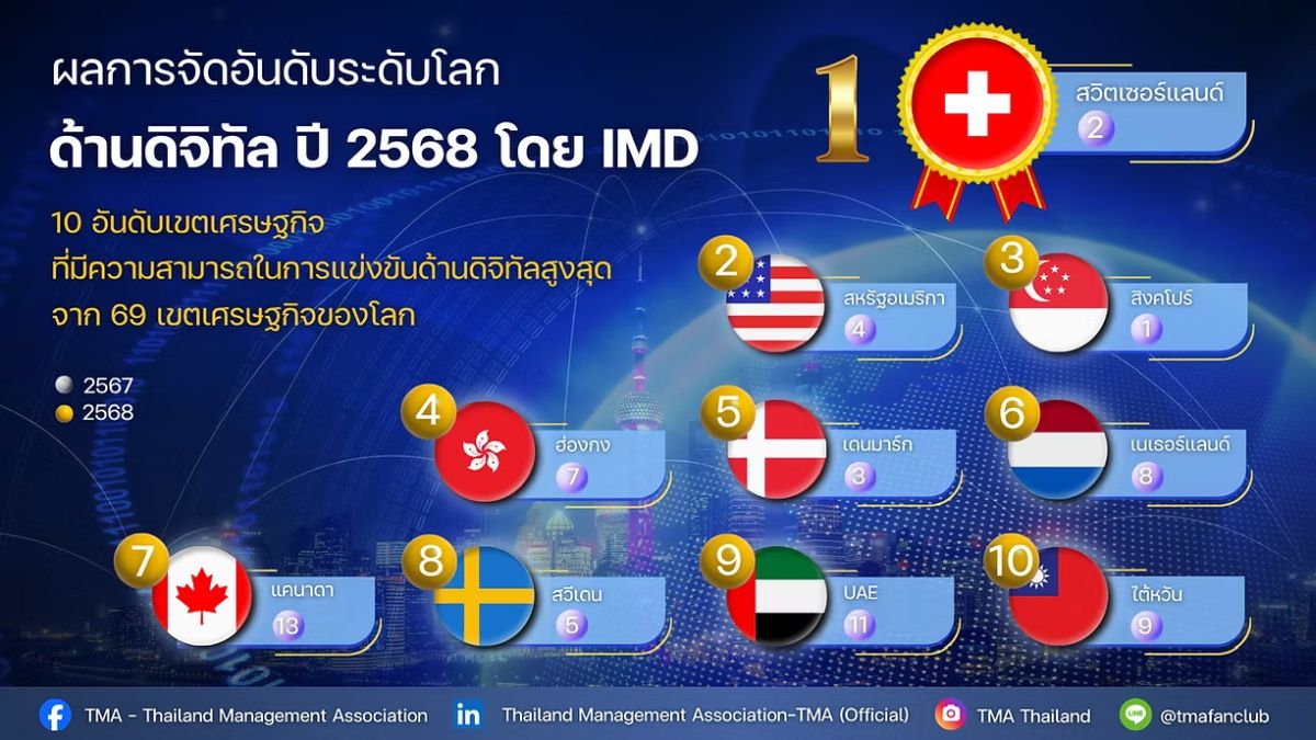 สมาคมการจัดการธุรกิจแห่งประเทศไทย หรือ ทีเอ็มเอ (TMA) เผยผลการจัดอันดับขีดความสามารถในการแข่งขันด้านดิจิทัลของประเทศ (World Digital Competitiveness Ranking -WDCR) ที่จัดทำโดย World Competitiveness Center ของ International Institute for Management Development (IMD) สวิตเซอร์แลนด์ ประจำปี 2568 หรือรายงาน WDCR 2025 ซึ่งในปีนี้สวิตเซอร์แลนด์ครองอันดับที่ 1 ตามมาด้วยสหรัฐอเมริกาอยู่ในอันดับที่ 2 และ สิงคโปร์จัดอยู่ในอันดับที่ 3 ขณะที่ไทยถูกจัดให้อยู่ในอันดับที่ 38 จาก 69 เขตเศรษฐกิจ ลดลง 1 อันดับจากปีที่แล้ว