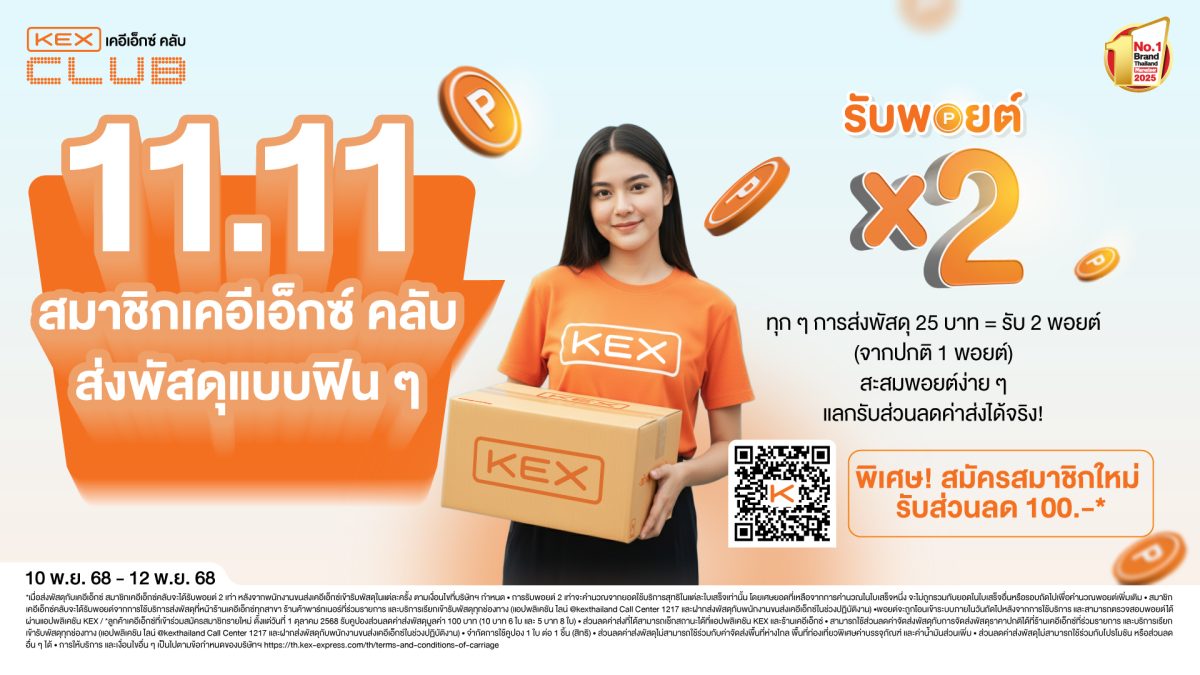 บริษัท เคอีเอ็กซ์ เอ็กซ์เพรส (ประเทศไทย) จำกัด (มหาชน) หรือ KEX ผู้นำด้านธุรกิจจัดส่งพัสดุด่วนทั่วไทย มอบสิทธิพิเศษส่งท้ายปีให้กับสมาชิก KEX Club ผ่านแคมเปญ “11.11 Double Day Double Point” ให้สมาชิกสะสมพอยต์ 2 เท่า จากเดิมที่ทุก ๆ การส่งพัสดุ 25 บาท ได้รับ 1 พอยต์ เพิ่มเป็น 2 พอยต์ จากยอดใช้บริการระหว่างวันที่ 10–12 พฤศจิกายน 2568 เพื่อขอบคุณลูกค้าที่ไว้วางใจใช้บริการอย่างต่อเนื่อง
