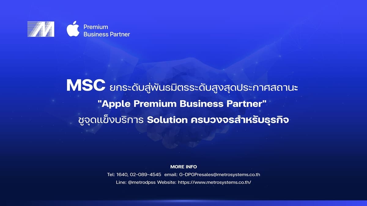 บริษัท เมโทรซิสเต็มส์คอร์ปอเรชั่น จำกัด (มหาชน) หรือ MSC มีความยินดีเป็นอย่างยิ่งที่จะประกาศความสำเร็จครั้งสำคัญ ด้วยการได้รับการแต่งตั้งให้เป็น “Apple Premium Business Partner” อย่างเป็นทางการ ภายใต้เครือข่ายพันธมิตรของ Apple (Apple Partner Network) เพื่อส่งมอบ ประสบการณ์และโซลูชันครบวงจรสำหรับภาคธุรกิจ โดยเฉพาะองค์กรและธุรกิจขนาดกลางถึงขนาดใหญ่ (SMB และ Enterprise) ตั้งแต่การวางแผนกลยุทธ์ การจัดหาอุปกรณ์ การติดตั้ง ไปจนถึงการบริหารจัดการอย่างมีประสิทธิภาพ