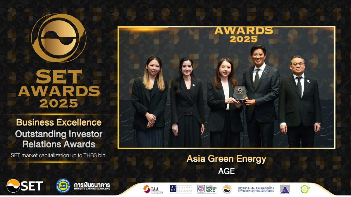 บริษัท เอเชีย กรีน เอนเนอจี จำกัด (มหาชน) หรือ AGE ได้รับรางวัล Outstanding Investor Relations Awards กลุ่ม Business Excellence จากเวที SET Awards 2025 ซึ่งจัดโดยตลาดหลักทรัพย์แห่งประเทศไทยร่วมกับวารสารการเงินธนาคาร รางวัลนี้สะท้อนถึงความโดดเด่นของบริษัทในการดำเนินงานด้านนักลงทุนสัมพันธ์อย่างโปร่งใส รอบด้าน และยึดมั่นในหลักธรรมาภิบาลรางวัลดังกล่าวยังตอกย้ำถึง บทบาทของผู้บริหาร ที่ให้ความสำคัญและสนับสนุนงานด้านนักInvestor Relations อย่างใกล้ชิด ส่งผลให้ AGE สามารถเสริมสร้างการสื่อสารกับผู้ลงทุนได้อย่างมีประสิทธิภาพ ทั้งในด้านการเปิดเผยข้อมูลที่ครบถ้วน การถ่ายทอดทิศทางธุรกิจอย่างชัดเจน และการส่งเสริมความเชื่อมั่นในศักยภาพของบริษัทนอกจากนี้ รางวัลนี้ยังสะท้อนถึงพื้นฐานการดำเนินธุรกิจของ AGE ที่ให้ความสำคัญกับความยั่งยืนในทุกมิติ ทั้งด้านเศรษฐกิจ ธรรมาภิบาล (Corporate Governance) ความรับผิดชอบต่อสิ่งแวดล้อม สังคม และการดูแลผู้มีส่วนได้เสีย ซึ่งเป็นหัวใจสำคัญในการขับเคลื่อนองค์กรให้เติบโตอย่างมีเสถียรภาพและยั่งยืน โดยอาศัยกลยุทธ์ที่รอบคอบ และการบริหารจัดการที่มีประสิทธิภาพAGE ยังคงเดินหน้าพัฒนางานด้านนักลงทุนสัมพันธ์ พร้อมเพิ่มระดับความโปร่งใส และยกระดับมาตรฐาน ESG เพื่อสนับสนุนการเติบโตขององค์กรในระยะยาว และสร้างคุณค่าให้แก่ผู้ลงทุนและสังคมอย่างต่อเนื่อง