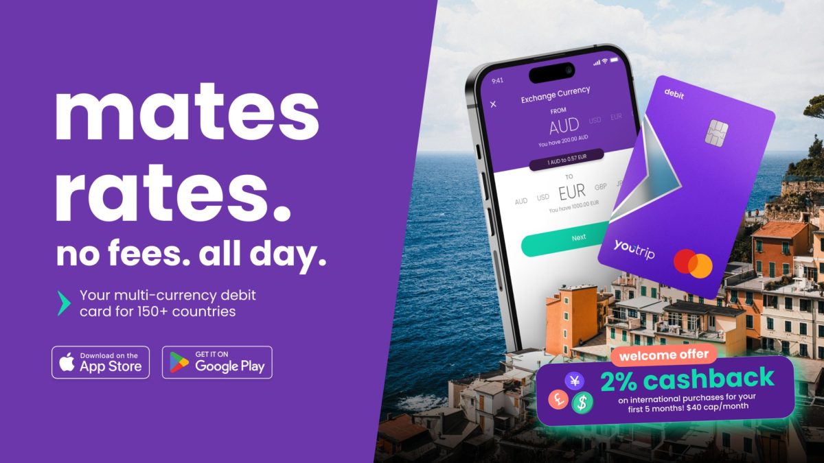 การเปิดตัวก่อนเทศกาลท่องเที่ยวช่วงคริสต์มาส ทำให้ YouTrip เป็นอีกหนึ่งทางเลือกที่ตอบโจทย์นักเดินทางด้วยแนวคิด “mates rates, no fees” ยกตัวอย่างเช่น เมื่อแลกเงิน 1,000 ดอลลาร์ออสเตรเลีย จะได้รับเงินเพิ่มขึ้นกว่า 40 ดอลลาร์ออสเตรเลีย ในรูปแบบของสกุลเงินต่างประเทศเมื่อเทียบกับคู่แข่ง เช่น เยนญี่ปุ่น เพิ่มอีก ¥4,105[3]