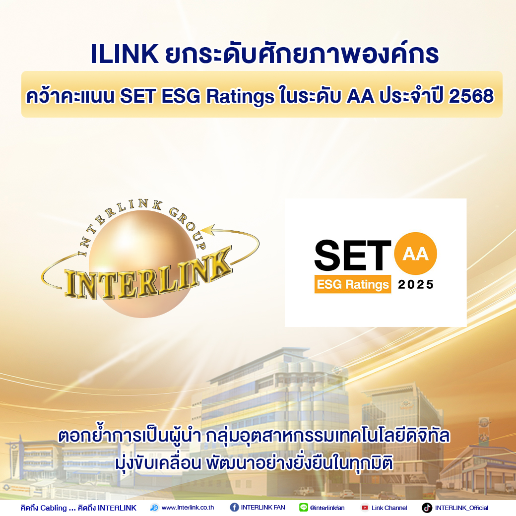 เมื่อวันที่ 12 ธันวาคม 2568 บริษัท อินเตอร์ลิ้งค์ คอมมิวนิเคชั่น จำกัด (มหาชน) หรือ ILINK ได้รับประกาศผล SET ESG Ratings 2568 ในระดับ AA ในหมวดอุตสาหกรรม Technology จากตลาดหลักทรัพย์แห่งประเทศไทย โดยในระดับนี้ มีบริษัทจดทะเบียนที่ผ่านเกณฑ์คุณภาพผ่านการประเมินหุ้นยั่งยืน SET ESG Ratings จำนวนทั้งสิ้น 80 บริษัท จากการประเมินหุ้นยั่งยืน SET ESG Ratings ของตลาดหลักทรัพย์ฯ ประจำปี 2568 โดยมี บริษัทจดทะเบียนที่ได้รับการประกาศผลประเมิน รวมทั้งสิ้น 265 บริษัท