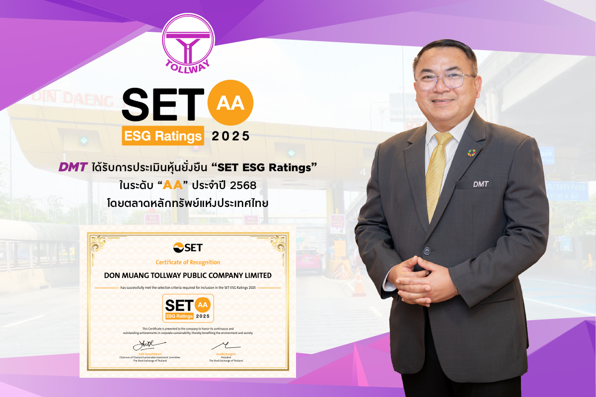 ดร.ศักดิ์ดา พรรณไวย กรรมการผู้จัดการ บริษัท ทางยกระดับดอนเมือง จำกัด (มหาชน) หรือ DMT เปิดเผยว่า เป็นความภาคภูมิใจอย่างยิ่ง ที่บริษัทฯ ได้รับการประเมินความยั่งยืนโดยตลาดหลักทรัพย์แห่งประเทศไทย SET ESG Ratings ประจำปี 2568 ระดับ AA ในกลุ่มอุตสาหกรรมบริการต่อเนื่องเป็นปีที่ 2 ด้วยคะแนน 83 คะแนน จาก 265 บริษัทจดทะเบียน ซึ่งสะท้อนความมุ่งมั่นในการดำเนินธุรกิจควบคู่กับการคำนึงถึงสิ่งแวดล้อม สังคม และบริหารงานตามหลักบรรษัทภิบาล