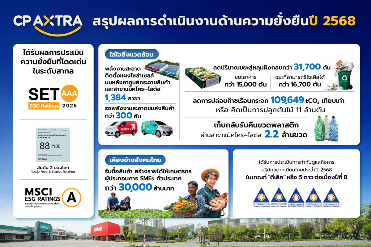 บริษัท ซีพี แอ็กซ์ตร้า จำกัด (มหาชน) หรือ CP AXTRA ผู้ดำเนินธุรกิจค้าส่งค้าปลีก “แม็คโคร–โลตัส” ตอกย้ำความเป็นผู้นำด้านความยั่งยืนของกลุ่มธุรกิจค้าส่งค้าปลีกไทย จากผลการดำเนินงานความด้านยั่งยืน ปี 2568 ที่ได้รับการยอมรับในระดับสากล โดยบริษัทฯ ได้รับการประเมิน SET ESG Ratings ระดับ “AAA” ซึ่งเป็นระดับสูงสุด ควบคู่กับ MSCI ESG Rating ระดับ “A” และคะแนน S&P Global Corporate Sustainability Assessment (CSA) 88/100 คะแนน สูงเป็น อันดับ 2 ของโลก ในกลุ่มอุตสาหกรรม Food & Staples Retailing สะท้อนความมุ่งมั่นในการดำเนินธุรกิจอย่างยั่งยืนที่เห็นผลเป็นรูปธรรม ครอบคลุมทั้งด้านสิ่งแวดล้อม สังคม และธรรมาภิบาล