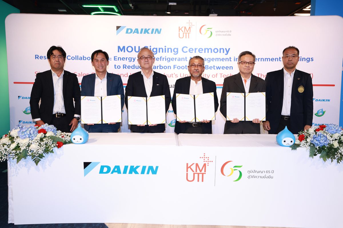 บริษัท สยามไดกิ้นเซลส์ จำกัด และมหาวิทยาลัยเทคโนโลยีพระจอมเกล้าธนบุรี (มจธ.) ร่วมลงนามบันทึกข้อตกลงความร่วมมือด้านการวิจัย (MOU) เพื่อขับเคลื่อน “การศึกษาวิจัยเรื่อง การจัดการพลังงานและสารทำความเย็นในอาคารภาครัฐเพื่อลดคาร์บอนฟุตพริ้นท์ของอาคาร” พร้อมยกระดับเป้าหมายด้านความยั่งยืน (Sustainability) โดยมอบ “อากาศที่ดี” ร่วมกับ “พลังงานที่มีประสิทธิภาพ” ผ่านการวิจัยและพัฒนาเทคโนโลยีที่ช่วยปรับปรุง IAQ ควบคู่การออกแบบและควบคุมระบบปรับอากาศให้ใช้พลังงานอย่างคุ้มค่า พร้อมยกระดับแนวทางการควบคุมมลพิษอย่างยั่งยืนในระยะยาว ให้สอดคล้องกับเป้าหมายด้าน Carbon Neutrality และการลดการปล่อยก๊าซเรือนกระจกที่กำลังเป็นวาระร่วมขององค์กรทุกภาคส่วน