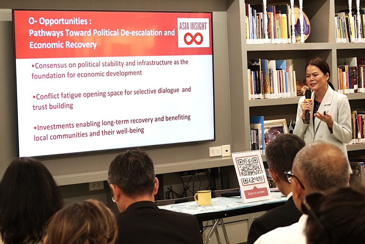 ด้าน นางสาวธัญณิชา เหลิมทอง หัวหน้าศูนย์วิจัยเศรษฐกิจเพื่อการลงทุน AI TECH กล่าวว่า การศึกษาวิจัยและจัดเวทีเสวนาครั้งนี้ มีเป้าหมายสำคัญเพื่อเติมเต็ม “ข้อมูลสถานการณ์จริงที่ทันต่อปัจจุบัน” ให้กับภาคธุรกิจไทย เพราะในช่วงเวลาที่โลกแห่งการลงทุน ต้องเผชิญความเสี่ยงที่เกิดจากข้อจำกัดเชิงระบบมากกว่าที่เคยเป็นมา โดยเฉพาะในประเทศที่ไม่สามารถแยกมิติทางการเมืองออกจากเศรษฐกิจได้อย่างเมียนมา การตัดสินใจลงทุนโดยอาศัยข้อมูลที่ไม่ทันต่อเหตุการณ์ หรือการมองเพียงตัวเลขทางเศรษฐกิจ อาจนำไปสู่การดำเนินธุรกิจที่ผิดพลาดในระยะยาวได้
