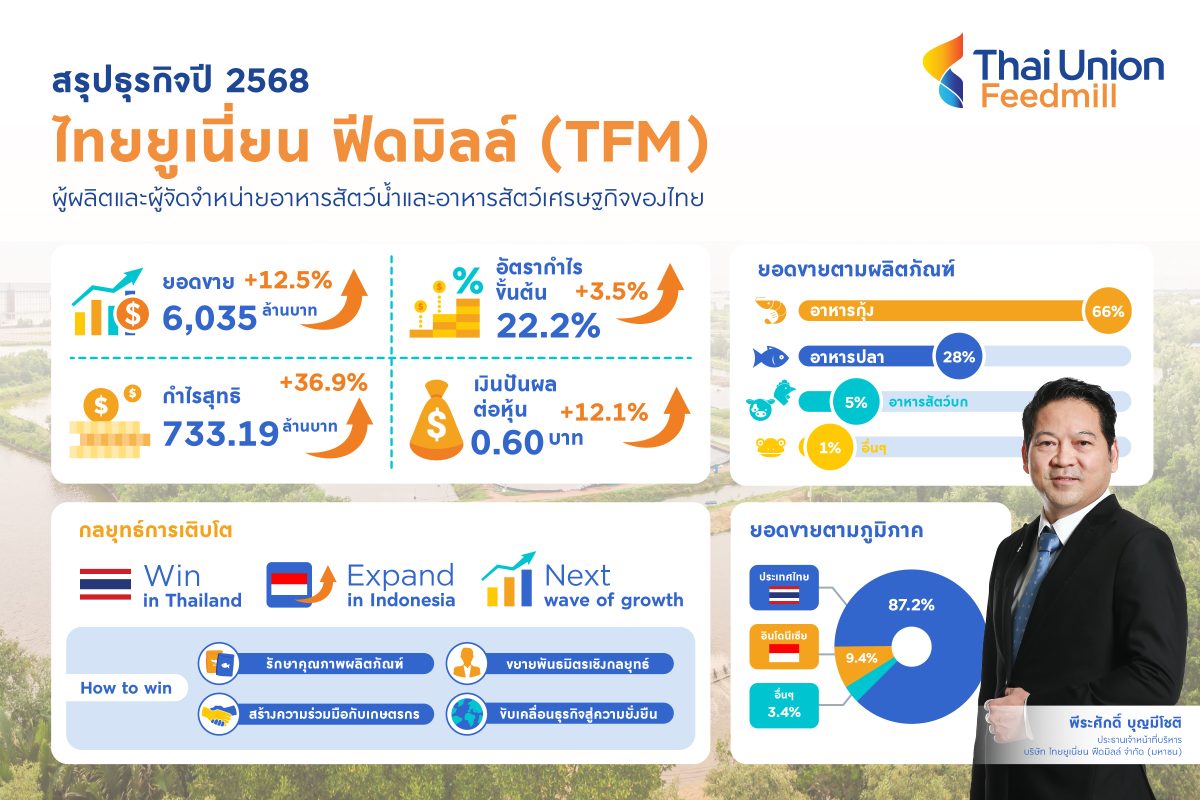 บริษัท ไทยยูเนี่ยน ฟีดมิลล์ จำกัด (มหาชน) หรือ TFM ผู้ผลิตและผู้จัดจำหน่ายอาหารสัตว์น้ำและอาหารสัตว์เศรษฐกิจของไทย ประกาศผลการดำเนินงานปี 2568 เติบโตแข็งแกร่งในทุกมิติ ทำยอดขายพุ่งแตะ 6,035 ล้านบาท เพิ่มขึ้น 12.5 เปอร์เซ็นต์ และทำกำไรสุทธิทะยานสู่ 733 ล้านบาท เติบโต 36.9 เปอร์เซ็นต์ เมื่อเทียบกับปีก่อน สะท้อนความสำเร็จจากการขยายฐานตลาดอาหารกุ้ง-อาหารปลา และการบริหารต้นทุนอย่างมีประสิทธิภาพ พร้อมอนุมัติจ่ายปันผลรวมทั้งปีในอัตรา 0.60 บาทต่อหุ้น