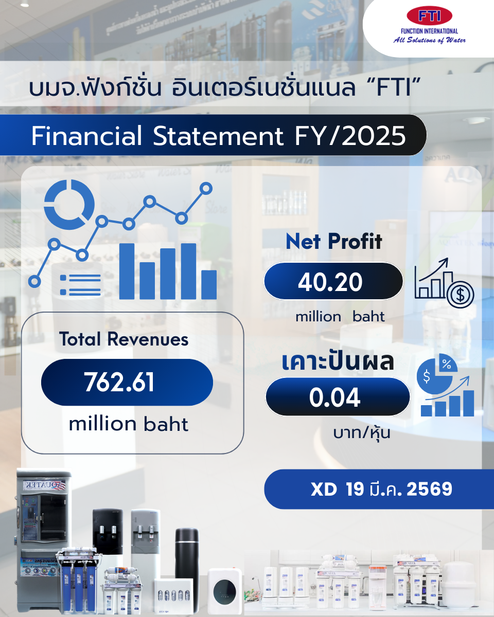 “ฟังก์ชั่น อินเตอร์เนชั่นแนล” ฟันกำไรปี 68 ที่ 40.20 ลบ. พุ่ง 9.93% กวาดรายได้ 762.61 ลบ. หลังคุมค่าใช้จ่ายดีต่อเนื่อง ต้นทุนทางการเงินลดลง เคาะจ่ายปันผล 0.04 บาทต่อหุ้น XD 11 มี.ค. 69