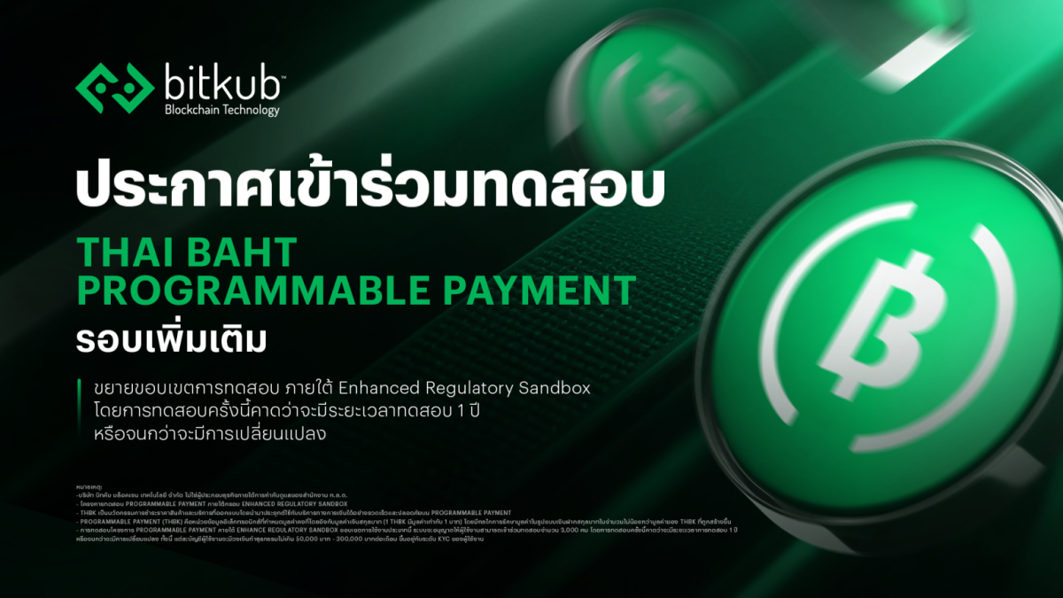 บริษัท บิทคับ บล็อคเชน เทคโนโลยี จำกัด ประกาศเข้าสู่การทดสอบโครงการ Programmable Payment ภายใต้กรอบ Enhanced Regulatory Sandbox (รอบเพิ่มเติม) อย่างเป็นทางการ ตั้งแต่วันที่ 1 เมษายน 2569 นี้เป็นต้นไป