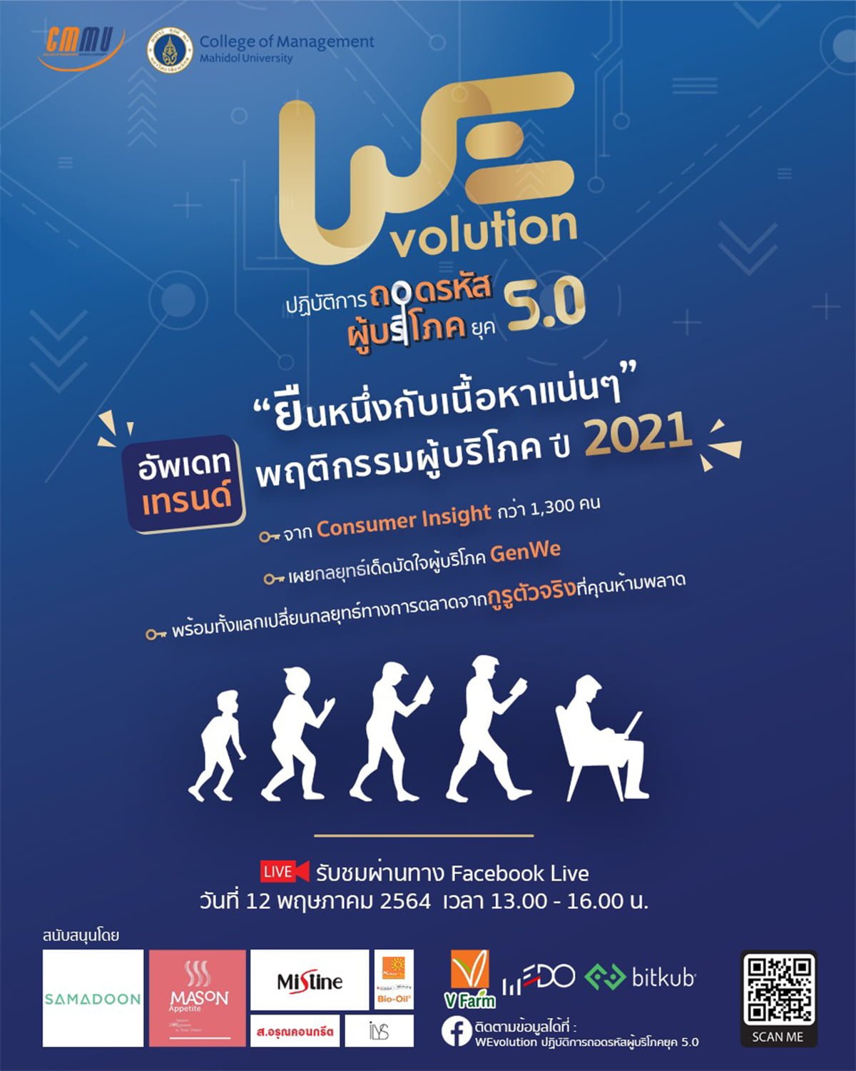 วิทยาลัยการจัดการ มหาวิทยาลัยมหิดล หรือ ซีเอ็มเอ็มยู (CMMU) ชวนบรรดามาร์เกตเตอร์และผู้ประกอบการ อัปเดตเทรนด์การตลาดในงานสุดยอดสัมมนาการตลาด ประจำปี 2564 ภายใต้หัวข้อ “WEvolution ปฎิบัติการถอดรหัสผู้บริโภคยุค 5.0” ผ่านเฟซบุ๊กไลฟ์ (Facebook Live) ที่จะพาล้วงลึกทัศนคติและพฤติกรรมผู้บริโภคกลุ่ม GenWe หรือ พฤติกรรมผู้บริโภค 5.0 ในปัจจุบัน และศึกษาวิธีปล่อยหมัดฮุคมัดใจผู้บริโภค พร้อมไฮไลท์ร่วมเสวนาแลกเปลี่ยนกลยุทธ์ทางการตลาดกับผู้บริหารยุคใหม่ อาทิ คุณอภิรักษ์ โกษะโยธิน ผู้บริหารแห่ง วีฟู้ดส์ (ประเทศไทย) คุณอภิรัตน์ หวานชะเอม ผู้นำด้านดิจิทัล แห่ง SCG Cement-Building Materials และคุณจิรายุส ทรัพย์ศรีโสภา ผู้ก่อตั้ง Bitkub ในวันพุธที่ 12 พฤษภาคม 2564 เวลา 13.00 – 16.00 น. ที่เพจเฟซบุ๊ก WEvolution ปฏิบัติการถอดรหัสผู้บริโภคยุค 5.0 ลงทะเบียนฟรี สำรองที่นั่งหน้าจอได้แล้ววันนี้ที่ https://fb.me/e/RXGg3U1N
