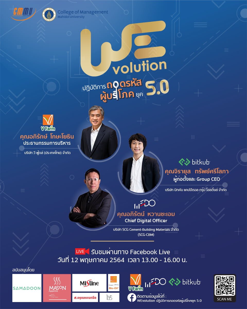 02-206-2000 หรือติดตามข้อมูลได้ที่เพจเฟซบุ๊ก CMMU Mahidol (https://www.facebook.com/CMMUMAHIDOL) และ WEvolution ปฎิบัติการถอดรหัสผู้บริโภคยุค 5.0 (https://www.facebook.com/WEvolution5.0)