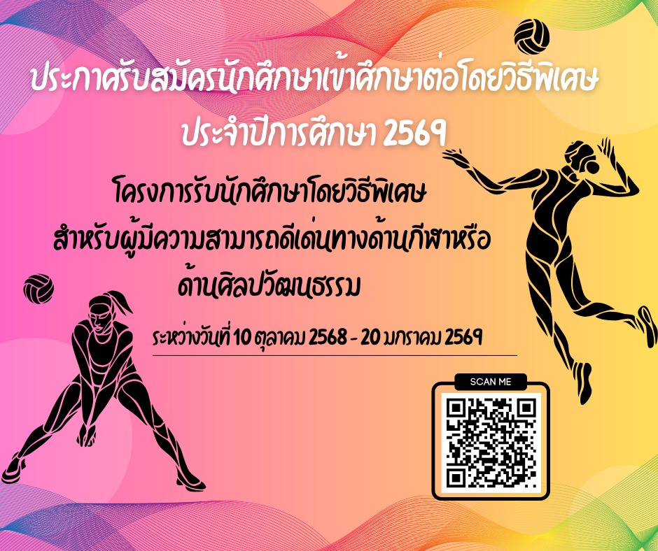 มหาวิทยาลัยเทคโนโลยีพระจอมเกล้าพระนครเหนือ (มจพ.) ประกาศรับสมัครนักศึกษาเข้าศึกษาใหม่ โครงการรับนักศึกษาโดยวิธีพิเศษ สำหรับผู้มีความสามารถดีเด่นด้านกีฬาหรือศิลปวัฒนธรรม ประจำปีการศึกษา 2569 เปิดรับสมัครระหว่างวันที่ 10 ตุลาคม 2568 – วันที่ 20 มกราคม 2569 รายละเอียดดังนี้
