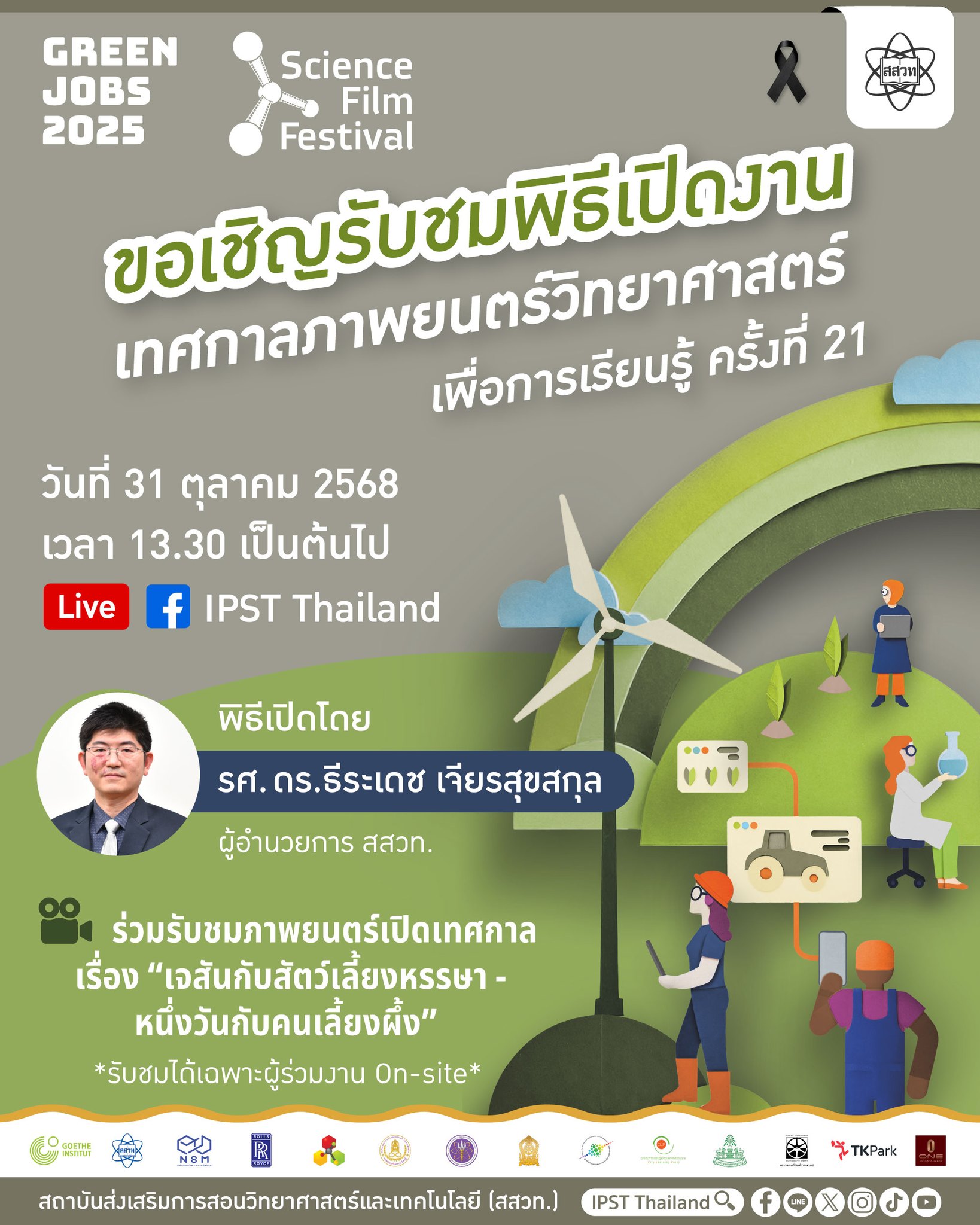 สถาบันส่งเสริมการสอนวิทยาศาสตร์และเทคโนโลยี (สสวท.) จัดงาน “เทศกาลภาพยนตร์วิทยาศาสตร์เพื่อการเรียนรู้ ครั้งที่ 21” ภายใต้แนวคิด “งานสีเขียว (Green Jobs)” ในวันที่ 31 ตุลาคม 2568 เวลา 13.30 น. โดยมี รองศาสตราจารย์ ดร.ธีระเดช เจียรสุขสกุล ผู้อำนวยการ สสวท. ผู้แทนรัฐมนตรีว่าการกระทรวงศึกษาธิการ เป็นประธานในพิธี พร้อมด้วย ดร.ชัยวุฒิ เลิศวนสิริวรรณ ผู้ช่วยผู้อำนวยการ สสวท. และคณะผู้บริหารระดับสูงจากองค์กรร่วมจัดเข้าร่วมพิธี ได้แก่ Ms. Sweta Madhuri Kannan ผู้แทนเอกอัครราชทูตสหพันธ์สาธารณรัฐเยอรมนี ประจำประเทศไทย นายโยฮันเนส โฮสส์เฟลด์ ผู้อำนวยการสถาบันเกอเธ่ ประเทศไทย ดร.สุภรา กมลพัฒนะ ผู้แทนผู้อำนวยการ อพวช. และอธิบดีกรมส่งเสริมการเรียนรู้ เข้าร่วม ณ หอประชุมสถาบันเกอเธ่ ซอยสาทร 1 กรุงเทพฯ