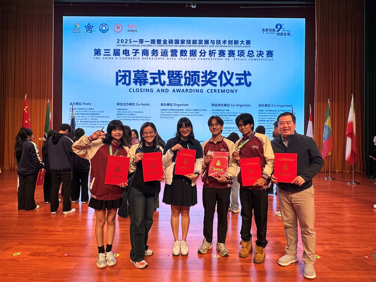 การแข่งขันเวทีแรก “2025 Belt & Road and BRICS Competition of Skills Development and Technology Innovation – Track of E-commerce Operations Data Analysis Competition” นับเป็นเวทีระดับนานาชาติที่ยิ่งใหญ่ด้าน E-commerce Intelligence และ Data Analytics จัดขึ้นที่เมืองหางโจว ศูนย์กลางอีคอมเมิร์ซระดับโลก ซึ่งทีมนักศึกษาชมรม “AI Spark Club” จากคณะเทคโนโลยีสารสนเทศ SPU นำโดย อาจารย์มาสวีร์ มาศดิศรโชติ และ อาจารย์ทิพย์อรุณ เขี้ยวแก้ว พร้อมด้วยนักศึกษา ได้แก่ นายคุณาธิป อู่ทอง และ นายประธาน นิลสนธิ์ สาขาวิทยาการคอมพิวเตอร์และนวัตกรรมการพัฒนาซอฟต์แวร์ รวมถึง นางสาวนิตย์ฌิมา แซ่โคว้ วิทยาลัยนานาชาติ ใช้ความสามารถสร้างผลงานวิเคราะห์ข้อมูลเชิงกลยุทธ์ด้านอีคอมเมิร์ซได้อย่างโดดเด่น จนคว้ารางวัลรองชนะเลิศอันดับ 2 (Second Runner-up) มาครองได้สำเร็จ พร้อมด้วยรางวัล Outstanding Instructor Award สำหรับอาจารย์ และรางวัล Outstanding Organization Award มอบให้แก่ มหาวิทยาลัยศรีปทุม