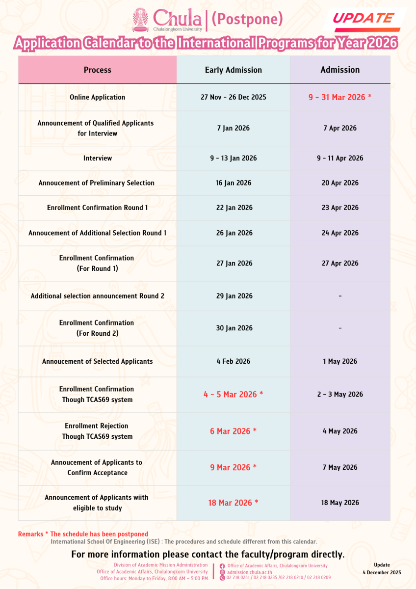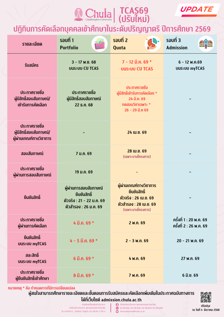 จุฬาลงกรณ์มหาวิทยาลัยเปลี่ยนแปลงกำหนดการรับสมัครและคัดเลือกนักเรียนเข้าศึกษาในจุฬาลงกรณ์มหาวิทยาลัย ระดับปริญญาตรี ปีการศึกษา 2569 (TCAS69) รอบที่ 1 แฟ้มสะสมผลงาน (Portfolio) รอบที่ 2 โควตา (Quota) ในหลักสูตรปกติ และรอบ Early Admission / รอบ Admission ในหลักสูตรนานาชาติ เนื่องจากสถานการณ์อุทกภัยภาคใต้ ตามมติของที่ประชุมอธิการบดีแห่งประเทศไทย (ทปอ.) ดังนี้