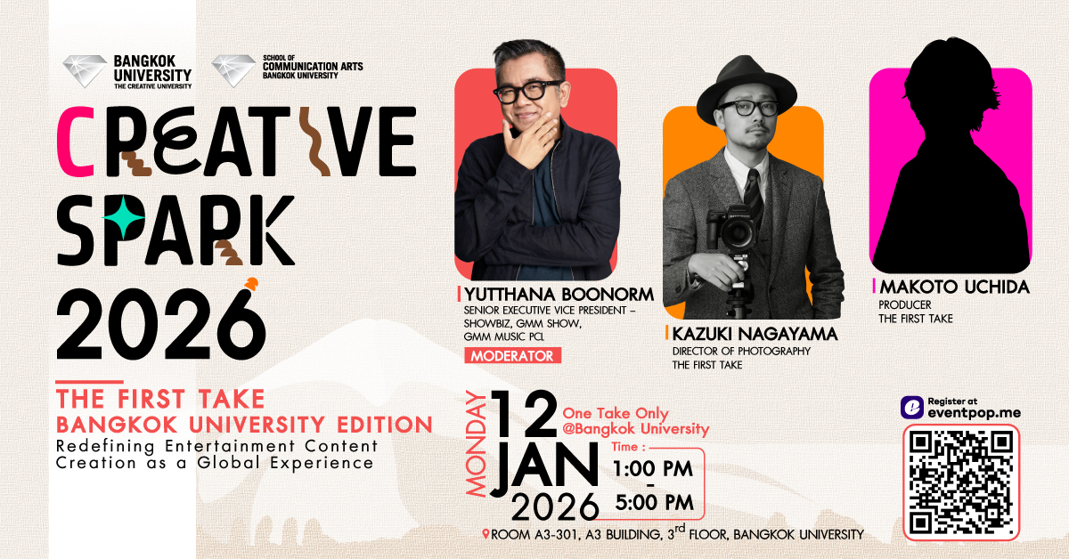 และนี่คือ One Take Only at Bangkok University ที่ไม่ควรพลาด! Exclusive สำหรับผู้ที่พร้อม SPARK จำนวน 300 ที่นั่ง *ไม่เสียค่าใช้จ่าย จำนวนจำกัด และไม่มีการบันทึกเทป! (การเสวนาดำเนินรายการเป็นภาษาญี่ปุ่น พร้อมเครื่องฟังบรรยายแปลภาษาไทย) โดยกิจกรรมดังกล่าวจะจัดขึ้นในวันจันทร์ที่ 12 มกราคม 2026 เวลา 13.00–17.00 น. ณ ห้อง A3-301 อาคาร A3 ชั้น 3 มหาวิทยาลัยกรุงเทพ สำรองที่นั่งที่ https://www.eventpop.me/s/creativespark2026