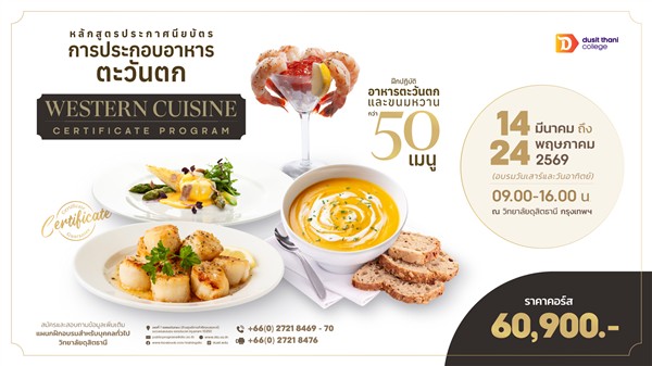 วิทยาลัยดุสิตธานี สถาบันอุดมศึกษาเอกชนชั้นนำทางด้านธุรกิจบริการ จัดหลักสูตร “การประกอบอาหารตะวันตก” สำหรับผู้ประกอบธุรกิจร้านอาหาร พ่อครัว เชฟมืออาชีพ และบุคคลทั่วไปที่สนใจ มุ่งเน้นการฝึกอบรมด้านการ ประกอบอาหารตะวันตกทั้งภาคทฤษฎี และภาคปฏิบัติเพื่อพัฒนาทักษะ เทคนิค กระบวนการ และเคล็ดลับในการประกอบอาหารตะวันตกให้ได้ มาตรฐานตามหลักเมนูของการประกอบอาหารสากลเพื่อสามารถนำ ไปประกอบอาชีพได้อย่างมีประสิทธิภาพ