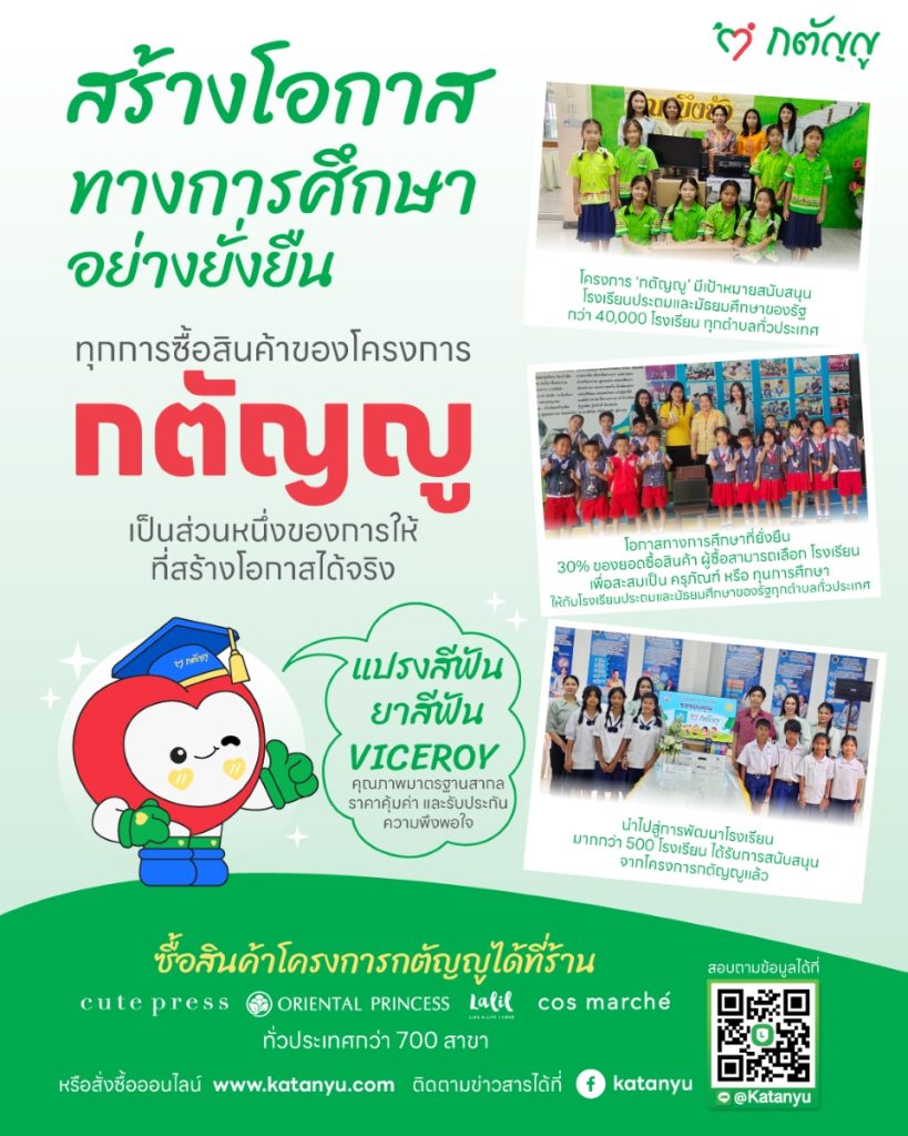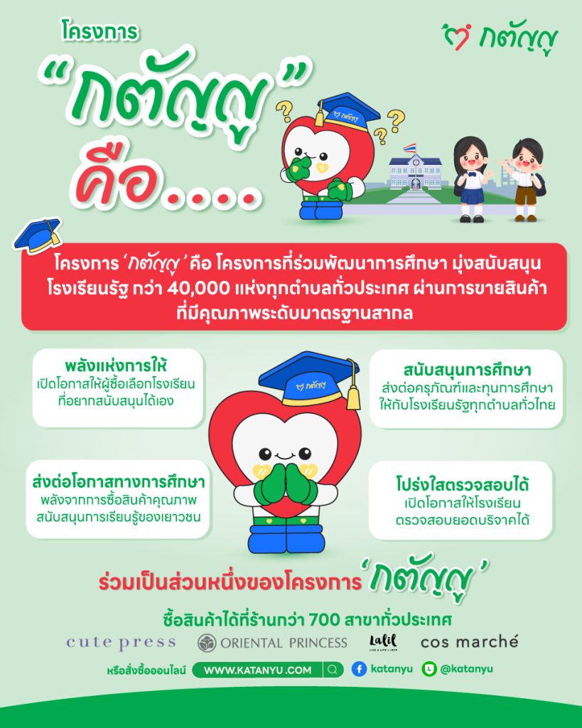 ขอเชิญชวนทุกท่านร่วมภาคภูมิใจกับความสำเร็จในครั้งนี้ และเป็นกระบอกเสียงในการประชาสัมพันธ์โครงการดีๆ นี้ต่อไป มาร่วมกันส่งต่อความหวัง สร้างรอยยิ้ม และเป็นลมใต้ปีกที่ช่วยสนับสนุนให้เด็กไทยได้ก้าวเดินตามความฝัน ด้วยสินค้าภายใต้ “โครงการกตัญญู” ที่พร้อมตอบโจทย์ในทุกความต้องการ ไม่ว่าจะซื้อไปใช้เอง ก็ได้รับสินค้าคุณภาพมาตรฐานสากลในราคาสุดคุ้ม ซื้อเป็นของฝากให้ญาติพี่น้อง ก็เป็นของขวัญที่เปี่ยมไปด้วยความหมาย หรือซื้อไปจำหน่ายต่อ ก็คุ้มค่าต่อยอดรายได้ และที่สำคัญหากท่านเลือกซื้อไปทำบุญ ท่านจะได้รับอานิสงส์แห่งบุญถึง 2 ต่อ คือได้ทำบุญด้วยสิ่งของเครื่องใช้ที่มีประโยชน์ และยังได้ร่วมสมทบทุนสร้างโอกาสทางการศึกษาให้กับเด็กไทยอีกด้วย