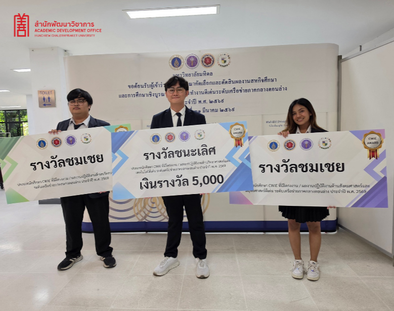 ศูนย์สหกิจศึกษา สำนักพัฒนาวิชาการ นำทีมโดย ผศ.ดร.วุฒิพงษ์ ทองก้อน ผู้อำนวยการสำนักพัฒนาวิชาการและหัวหน้าศูนย์สหกิจศึกษา พร้อมด้วยคณาจารย์จากคณะวิทยาศาสตร์และเทคโนโลยี และวิทยาลัยจีนศึกษา ได้พาตัวแทนของมหาวิทยาลัยบุกเวทีประชันศักยภาพใน “โครงการพิจารณาคัดเลือกและตัดสินผลงานสหกิจศึกษาและการศึกษาเชิงบูรณาการกับการทำงานดีเด่น ระดับเครือข่าย CWIE ภาคกลางตอนล่าง” ณ ห้องบรรยาย ศ. นพ. ชัชวาล โอสถานนท์ ชั้น 1 อาคารสำนักงานอธิการบดี มหาวิทยาลัยมหิดล ศาลายา​งานนี้บอกเลยว่าชาว HCU ของเราโชว์ฟอร์มเยี่ยม ปล่อยของกันแบบจัดเต็ม จนสามารถกวาดรางวัลแห่งความสำเร็จกลับมาได้อย่างยิ่งใหญ่สมศักดิ์ศรี! ขอเสียงปรบมือดังๆ รัวๆ ให้กับคนเก่งของเราทั้ง 4 ท่าน ดังนี้:
