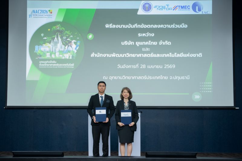 วันที่ 28 เมษายน 2569 ณ ห้องประชุมสราญวิทย์ SD601 อุทยานวิทยาศาสตร์ประเทศไทย จ.ปทุมธานี: สำนักงานพัฒนาวิทยาศาสตร์และเทคโนโลยีแห่งชาติ (สวทช.) และ บริษัท ยูแทค ไทย จำกัด (UTAC) จัดพิธีลงนามบันทึกข้อตกลงความร่วมมือ (MOU) ภายใต้ “โครงการความร่วมมือด้านวิชาการ การวิจัยและพัฒนาเพื่อการพัฒนานวัตกรรม และการพัฒนาบุคลากรอุตสาหกรรมเซมิคอนดักเตอร์” เพื่อสร้างความแข็งแกร่งให้กับอุตสาหกรรมอิเล็กทรอนิกส์ต้นน้ำของประเทศ