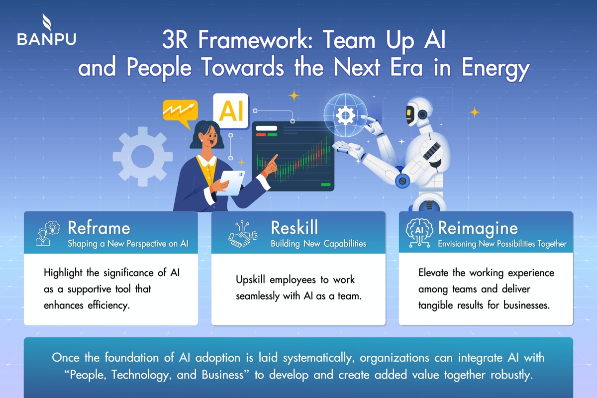 Banpu’s 3R framework lays the foundation for AI adoption in organizations in a systematic way. It prioritizes reframing employees’ perspectives, building new skills, and implementing practical applications in energy business operations. The approach underscores how AI integrates people, technology, and business to advance and create added value for a future-ready organization.