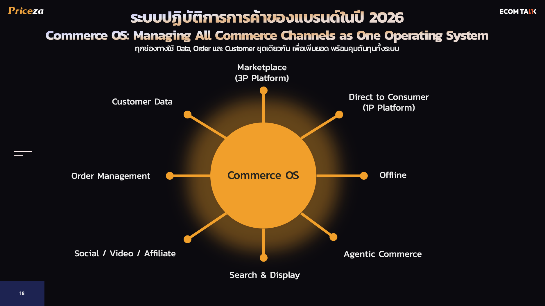 Thailand’s e-commerce market will continue to grow in 2026, but success will no longer come from simply adding more sales channels. According to insights shared by Thanawat Malabuppha, CEO & Co-Founder of Priceza, during the opening keynote session “Thailand E-Commerce Trends 2026” at ECOM TALK 2026, brands must now manage e-commerce as a single operating system, a concept he refers to as “Commerce OS.”