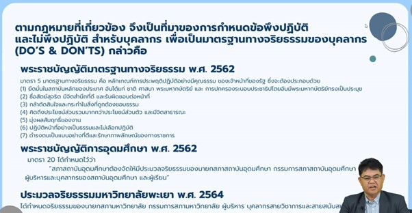 5. “Enhancing Ethical Standards for University Administrators and Personnel in Compliance with Relevant Legal Frameworks, Including the Constitution of The Kingdom of Thailand B.E. 2560 (2017) (Section 76), the Ethical Standards Act B.E. 2562 (2019) (Section 5), the Office of Prime Minister on the Giving or Receiving Gifts of State Officials B.E. 2565 (2022) (Sections 5-8, 18-19), and the Office of Prime Minister on Fundraising by State Agencies B.E. 2562 (2019) (Sections 6, 18-19)”